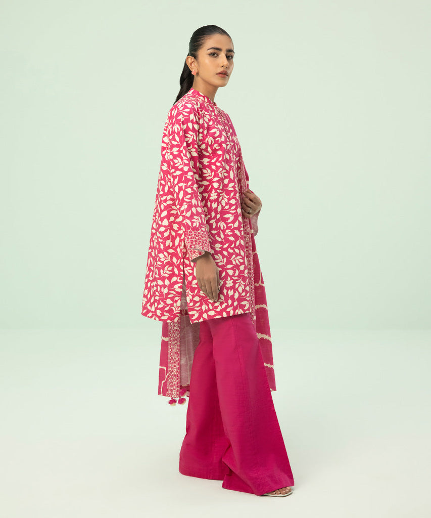 Our pink three-piece features intricately patterned shirt paired with an enticing dupatta and plain pants.