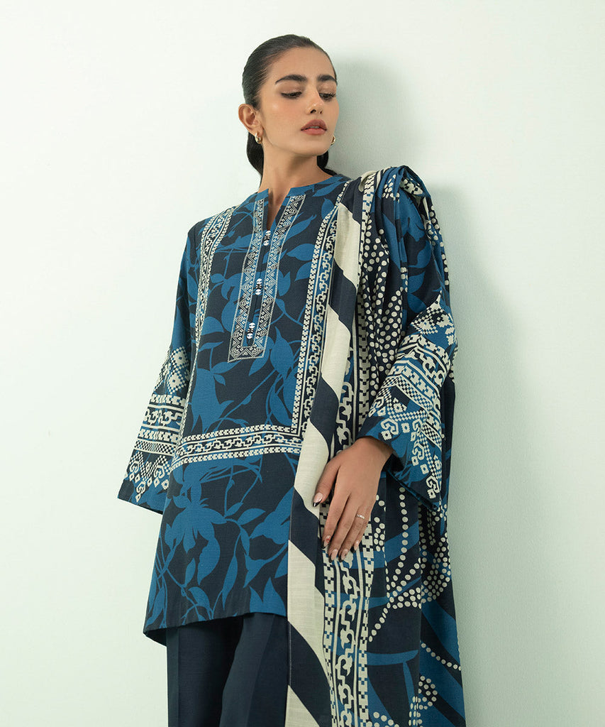 Capture contemporary flair this season with our navy blue three-piece ensemble featuring artistic florals and intrica...