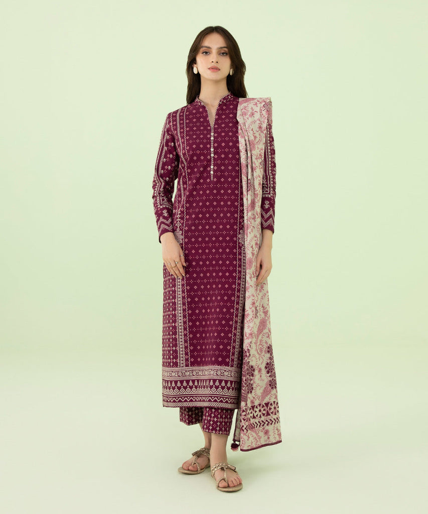 Mesmerize this season in our dark magenta three-piece ensemble accented with intricate details & floral patterns.