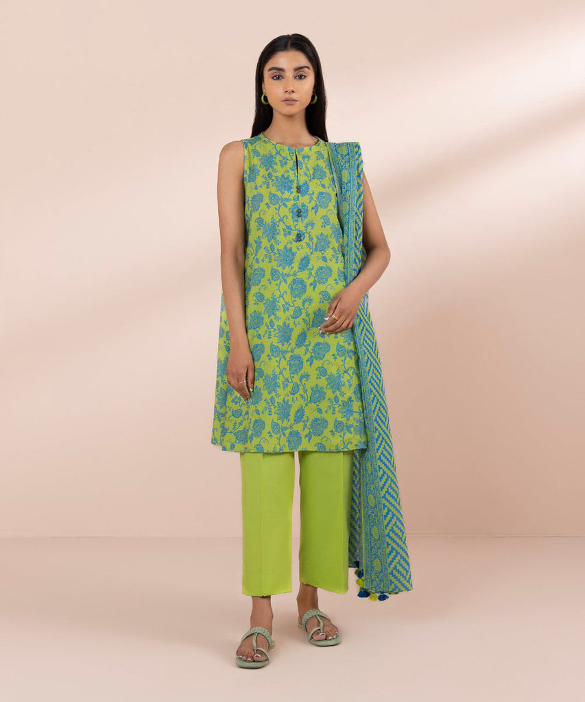 Add colour to your seasonal closet with our green floral printed three-piece featuring a lawn shirt, cambric trouser,...