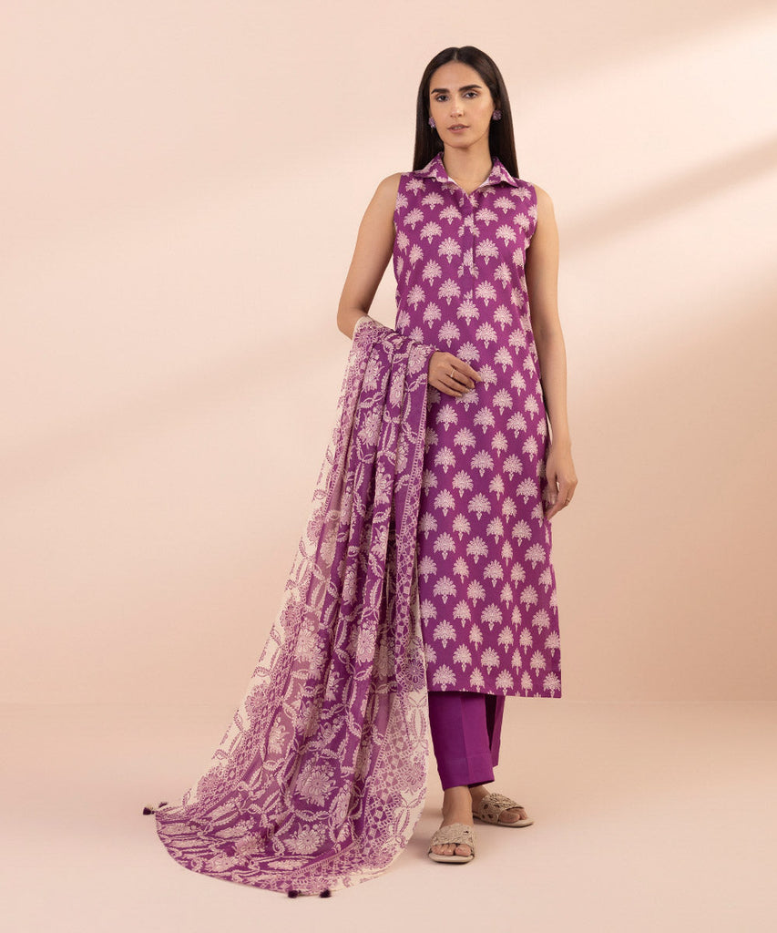 Add colour to your seasonal closet with our purple printed three-piece featuring a lawn shirt, cambric trouser, and voile dupatta.