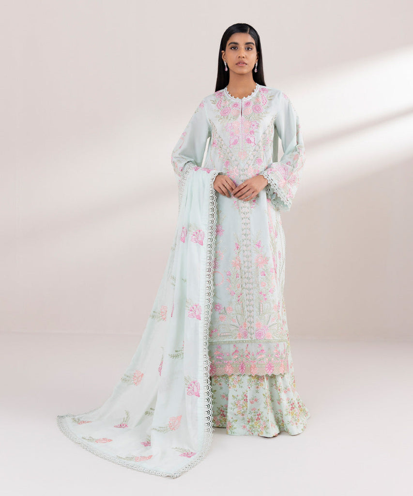 Complete your outfit with our pastel green embroidered dupatta with lace detailing.
