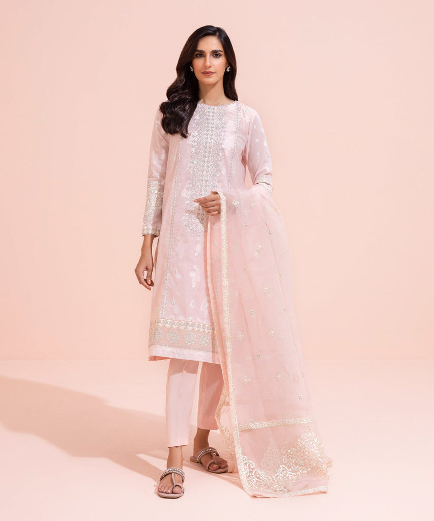 Elevate your outfit with our embroidered organza dupatta in blush pink.
