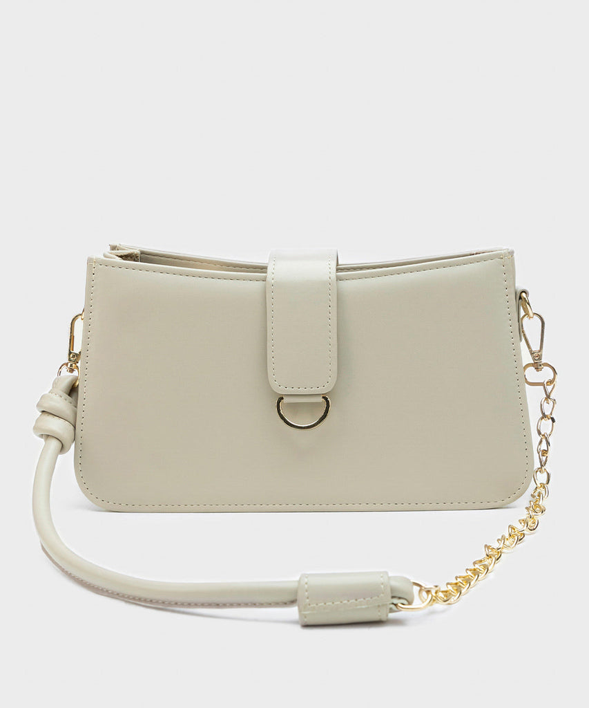 Elevate your summer style with our off white, faux leather shoulder bag featuring faux suede lining and zip closure.