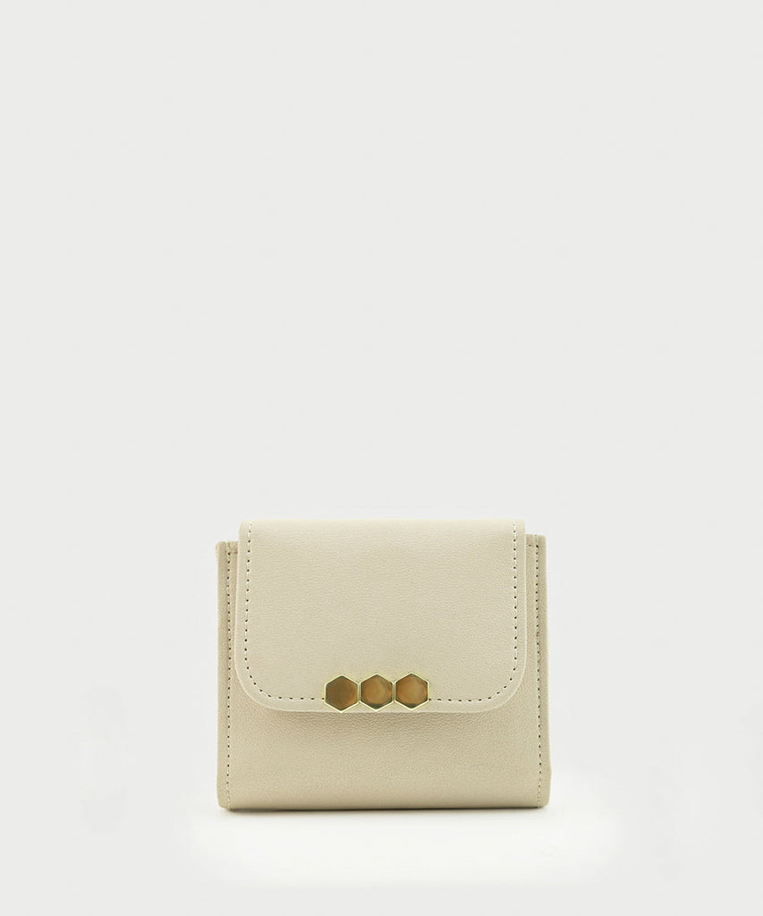 Add our off-white, textured faux leather wallet with a hexagonal metal stud detail on top is an every day essential.