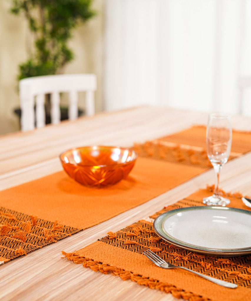 Elevate your space with our table runner in woven dobby design featuring stripes and tassels.