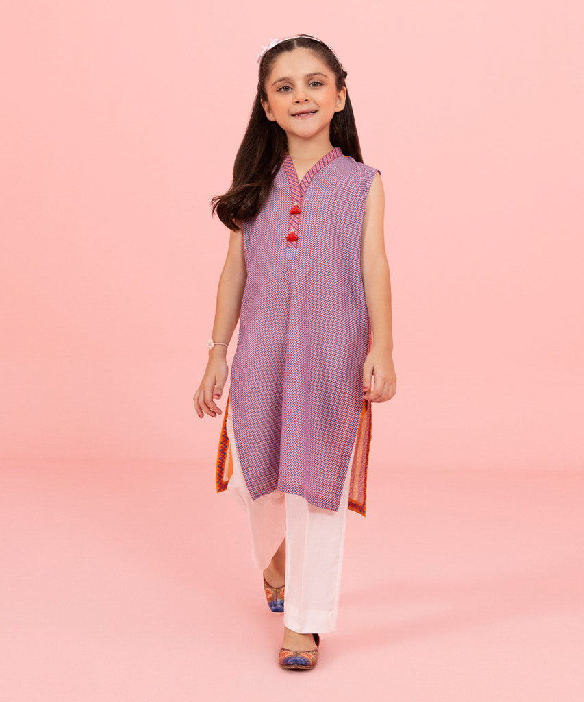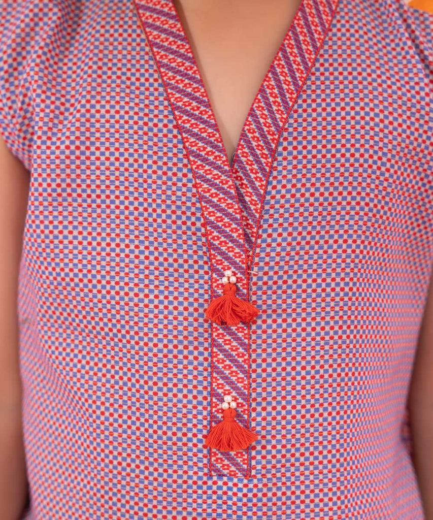 For an adorable day out don your little one in our sleeveless straight shirt featuring tassels and pearls.
