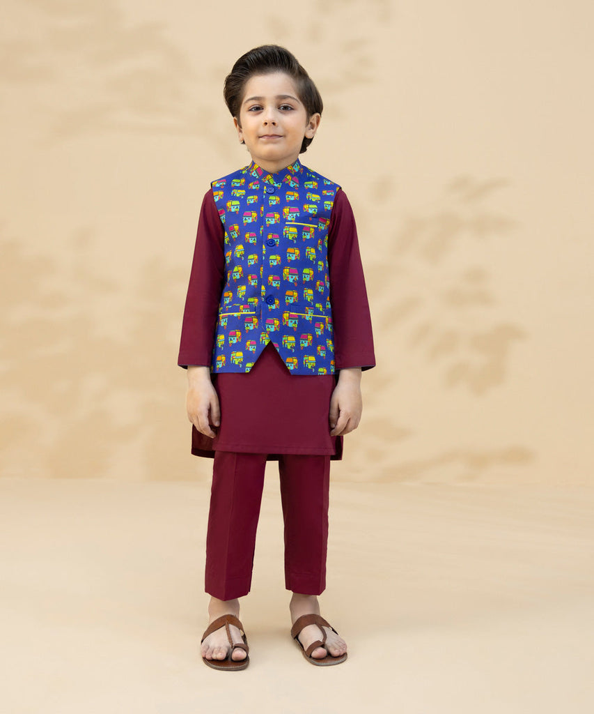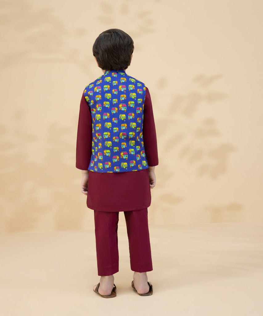 Elevate your little one's outfit with this blue printed waistcoat with two front pockets and contrast piping.