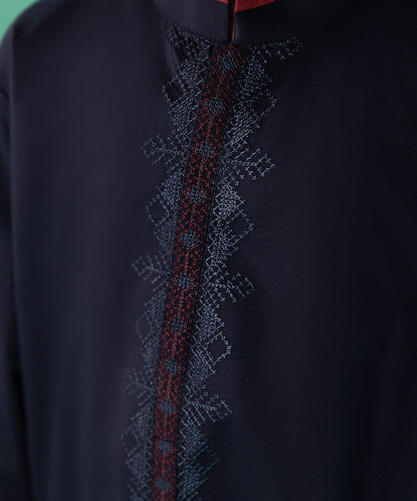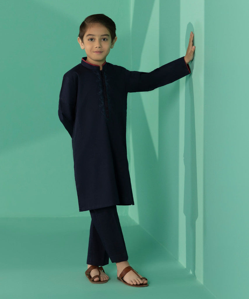 Let your little one make a dapper statement in this navy blue straight kurta featuring intricate embroidery paired with a straight trouser.