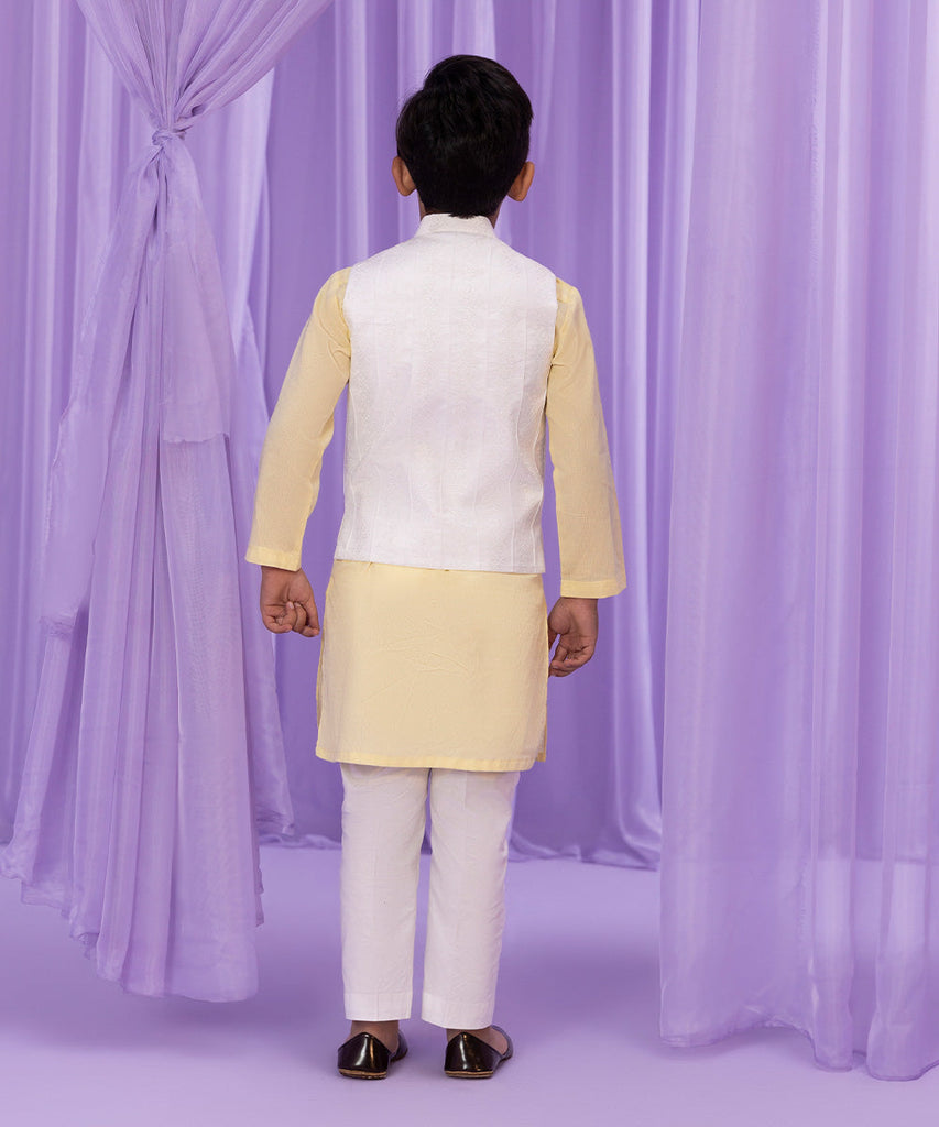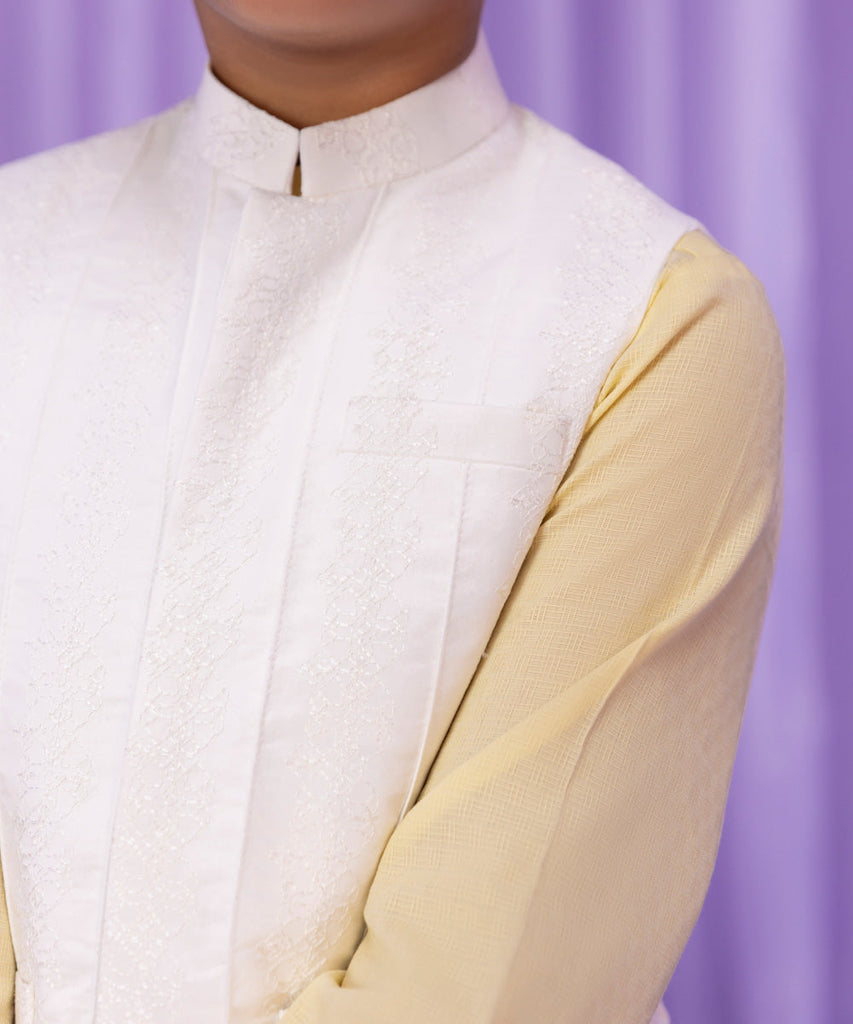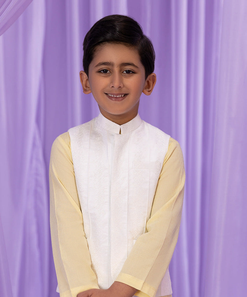 This Eid, uplift your little one's outfit with white waistcoat featuring all over schifli embroidery with pleat details.