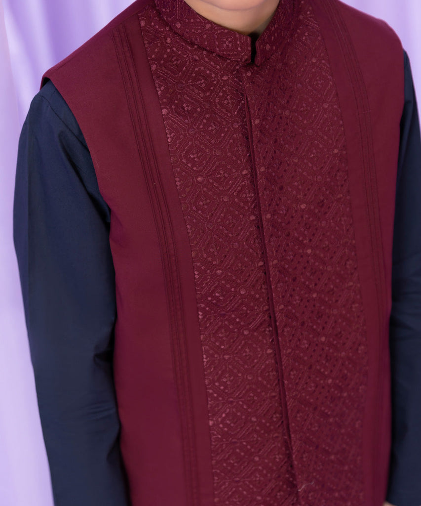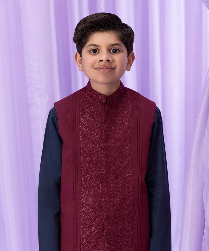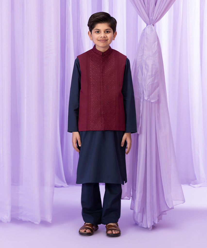 Let your little one shine in this dark blue three-piece suit featuring all over embroidered waistcoat and straight trousers.