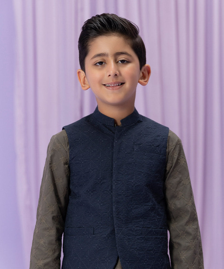 This season make a fashionable statement with your little one. WaistcoatWaist coat with all over schifli embroidery a...