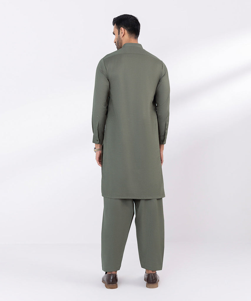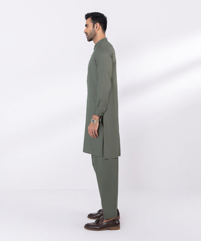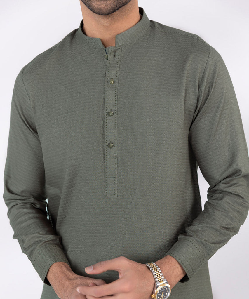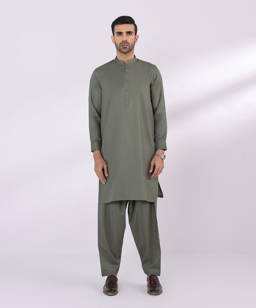 Elevate your everyday style in our olive cotton dobby straight kurta and shalwar.