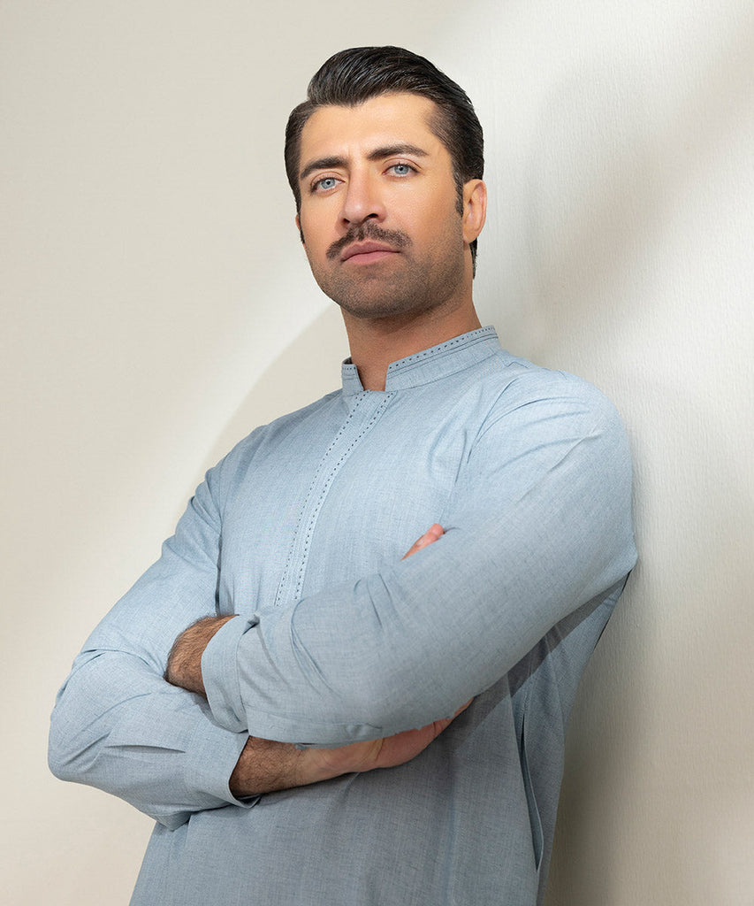 Elevate your everyday style in our blue grey, fancy wash & wear kurta and shalwar.