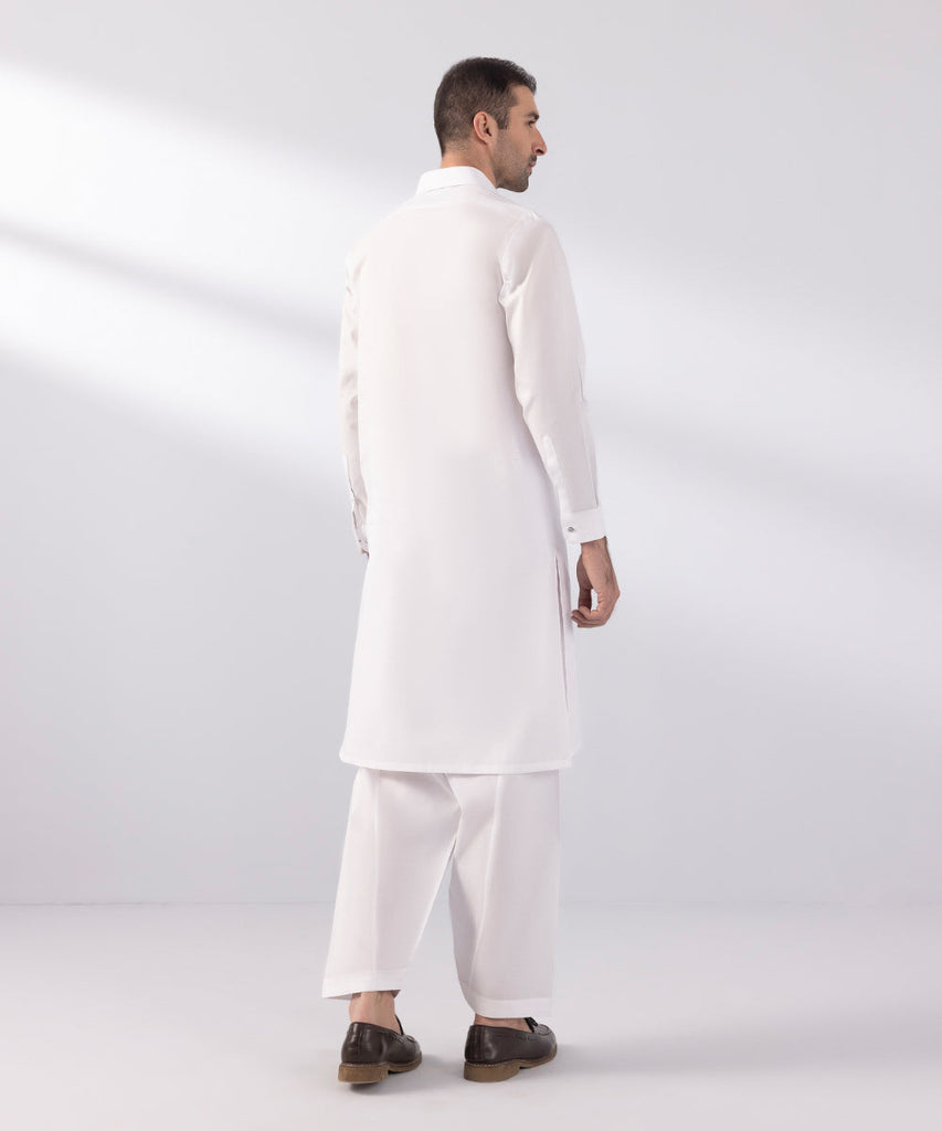Opt for an elegant Eid look with our white fine cotton two-piece suit featuring a straight kurta and shalwar.