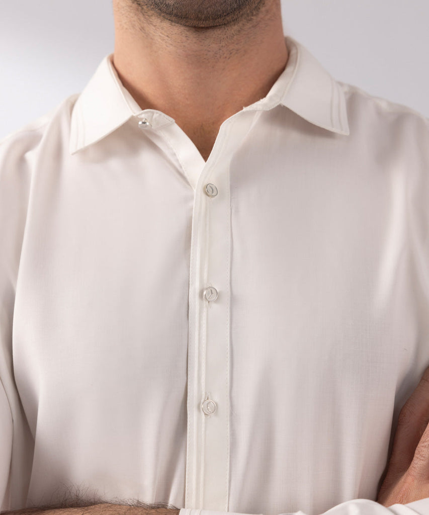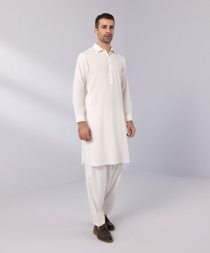 Create a traditional look this season in our off-white premium wash & wear round hem kurta paired with shalwar.