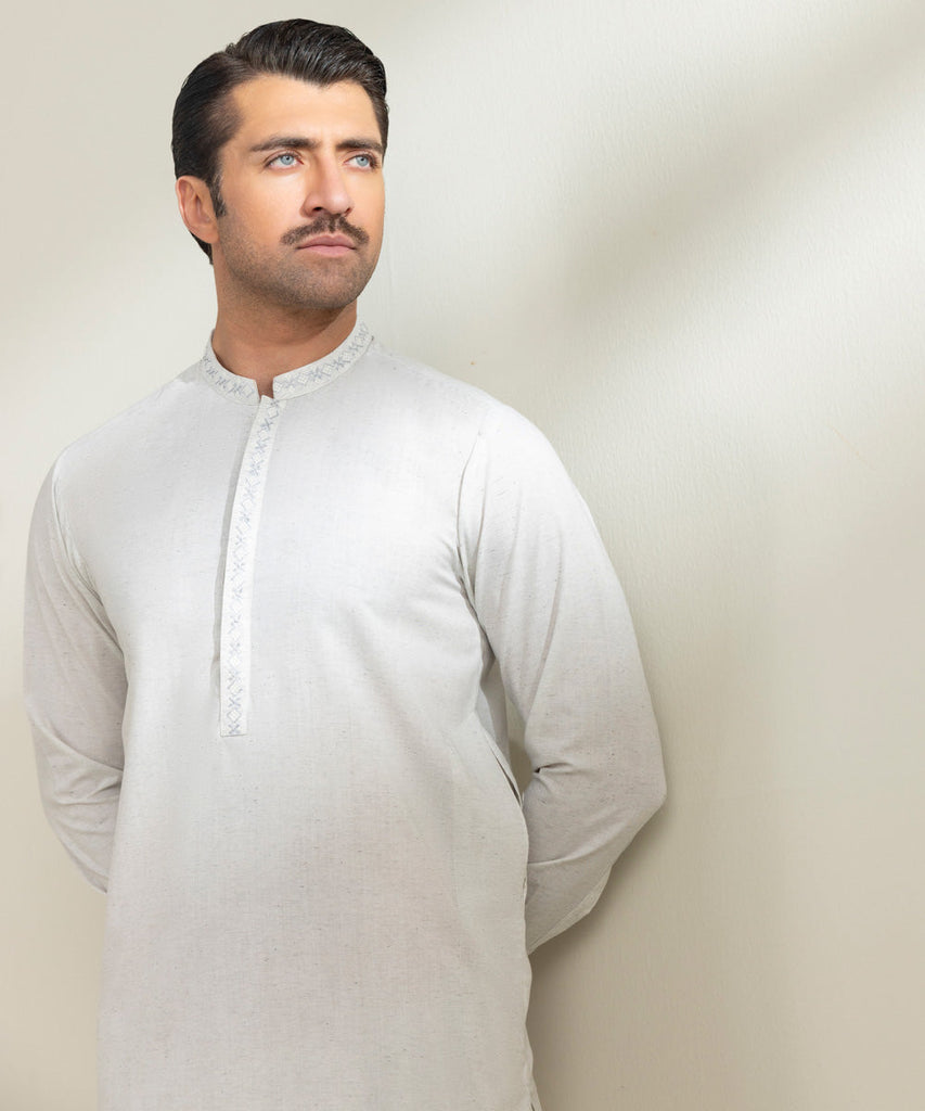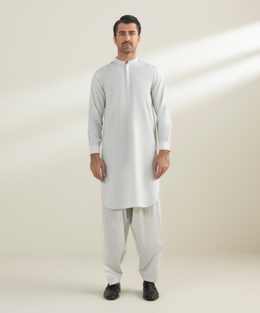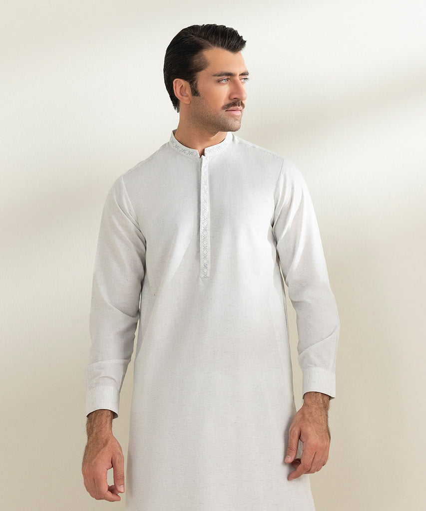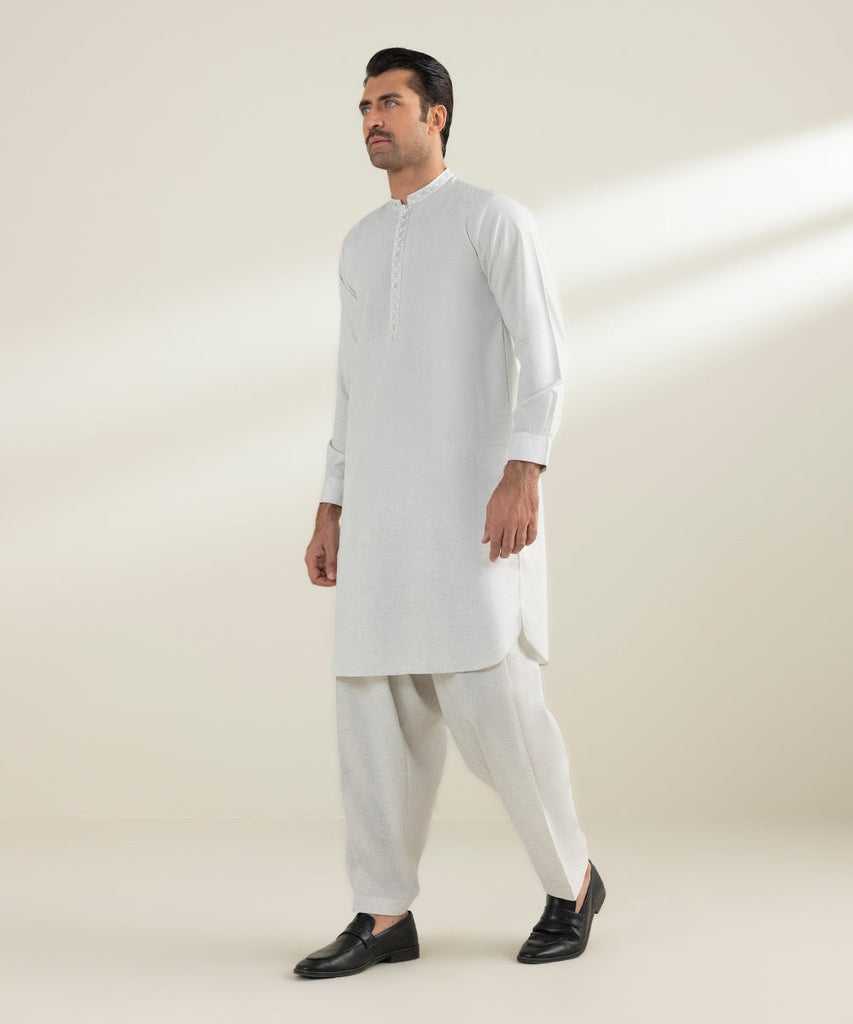 Curate a classic look in our white fancy wash & wear kurta and shalwar, accented with embroidery.