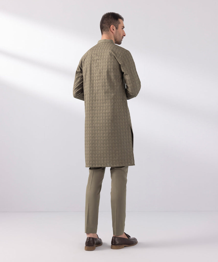 Make a dapper statement this Eid with our walnut brown schiffli embroidered suit featuring a straight kurta and shalwar.