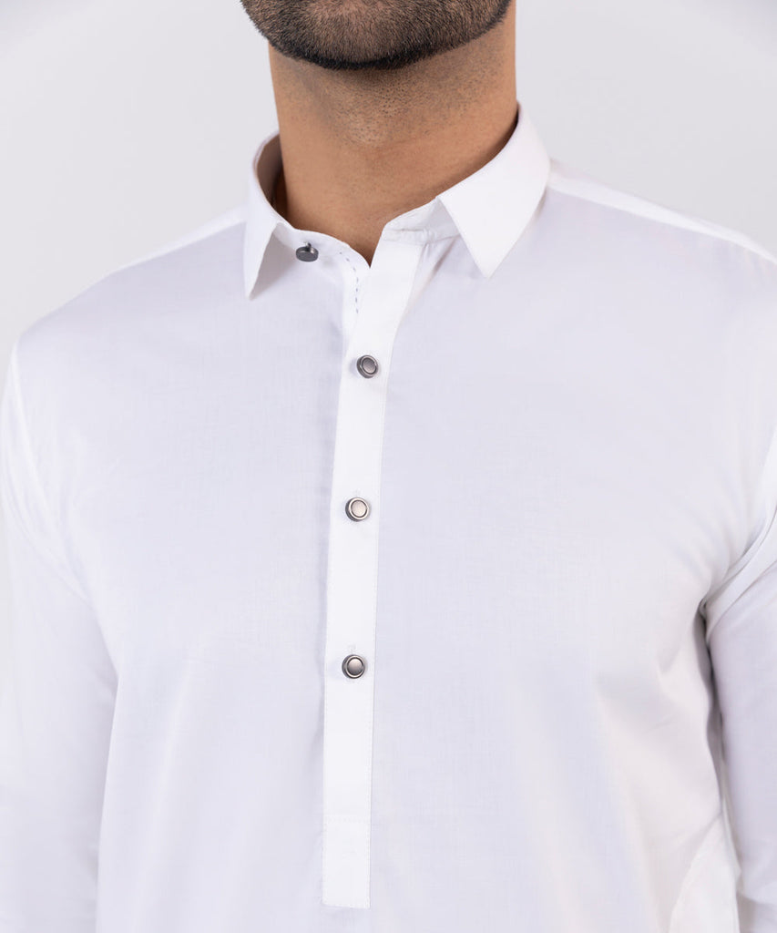 Make a dapper statement in our lightweight, and breathable white two-piece suit. With the finest quality Egyptian cotton and premium ammonia finish, elevate your traditional look with unparalleled sophistication.