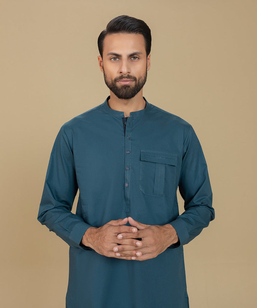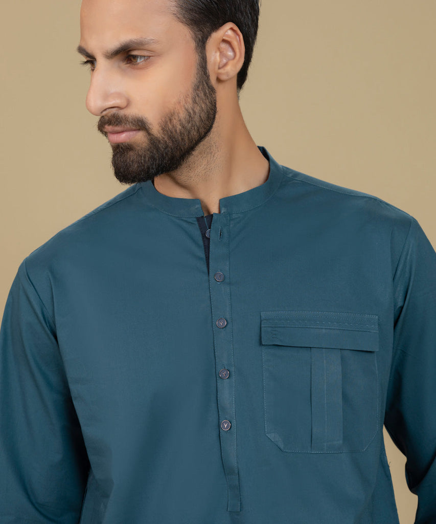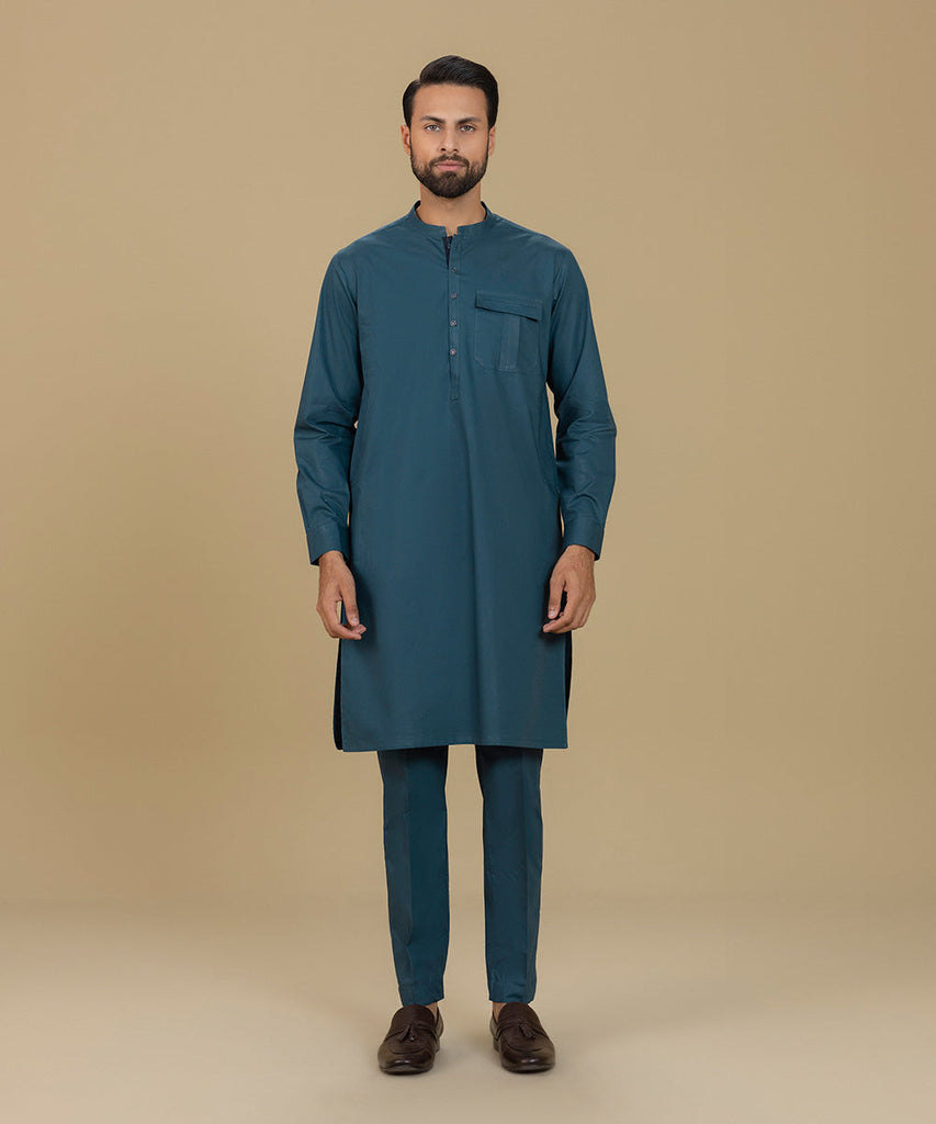 Uplift your style with our teal blue kurta trouser featuring detailing on front pocket.