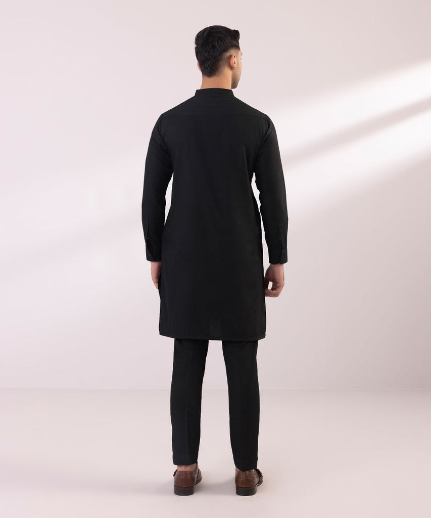 Elevate your seasonal look in our black wash & wear jacquard straight kurta paired with trouser.