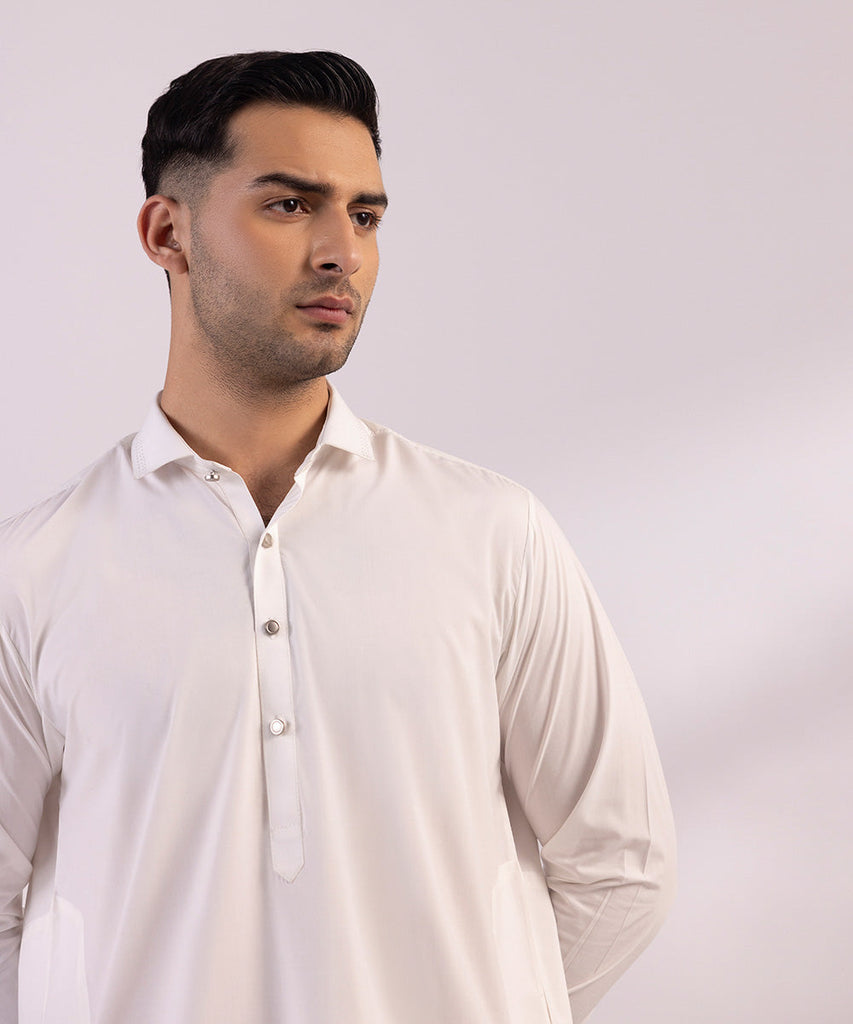 Elevate your festive attire in our lightweight, and breathable white two-piece suit. With the finest quality blended modal wrinkle free fabric, elevate your traditional look with unparalleled sophistication.