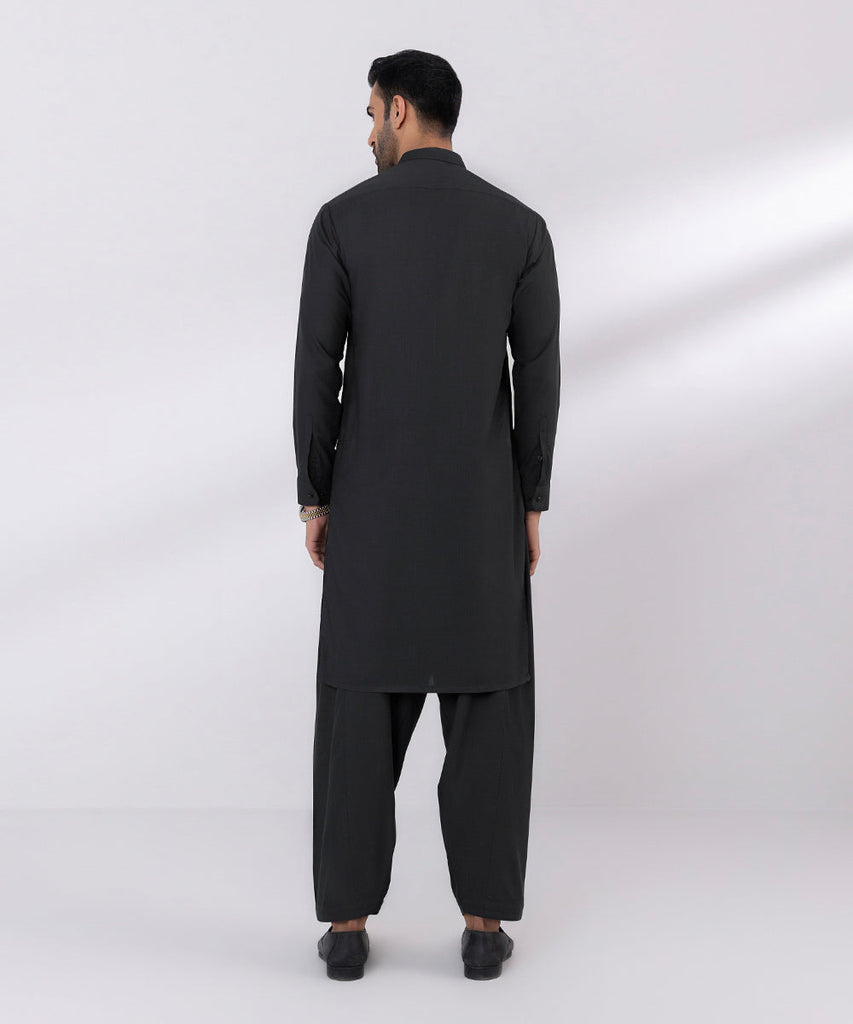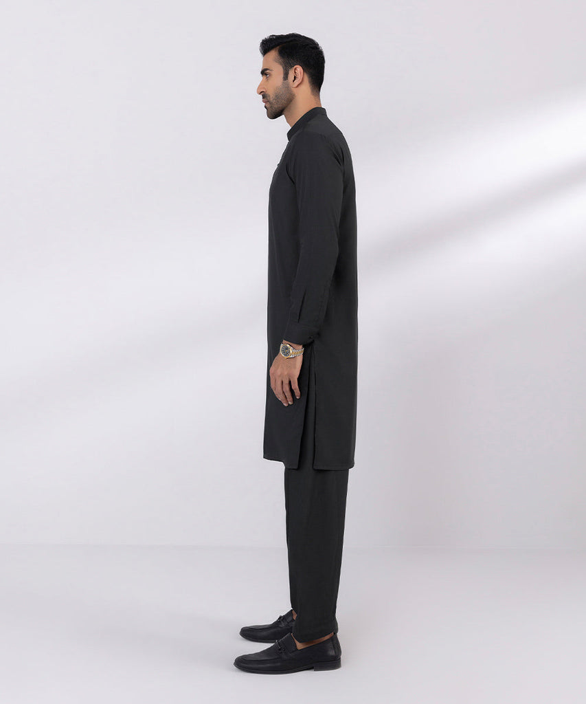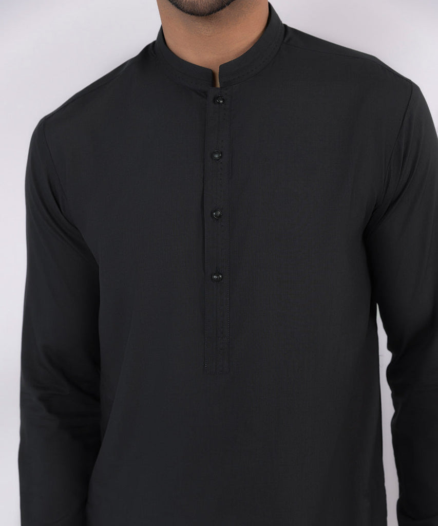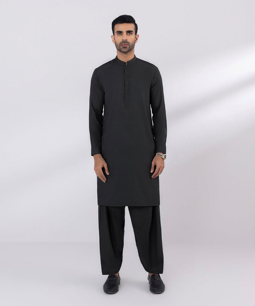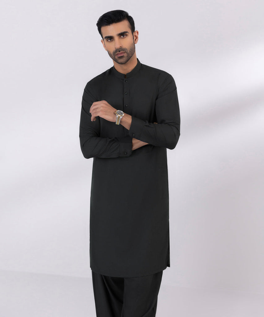 Create a traditional look this season in our jade black fancy wash & wear straight kurta paired with shalwar.