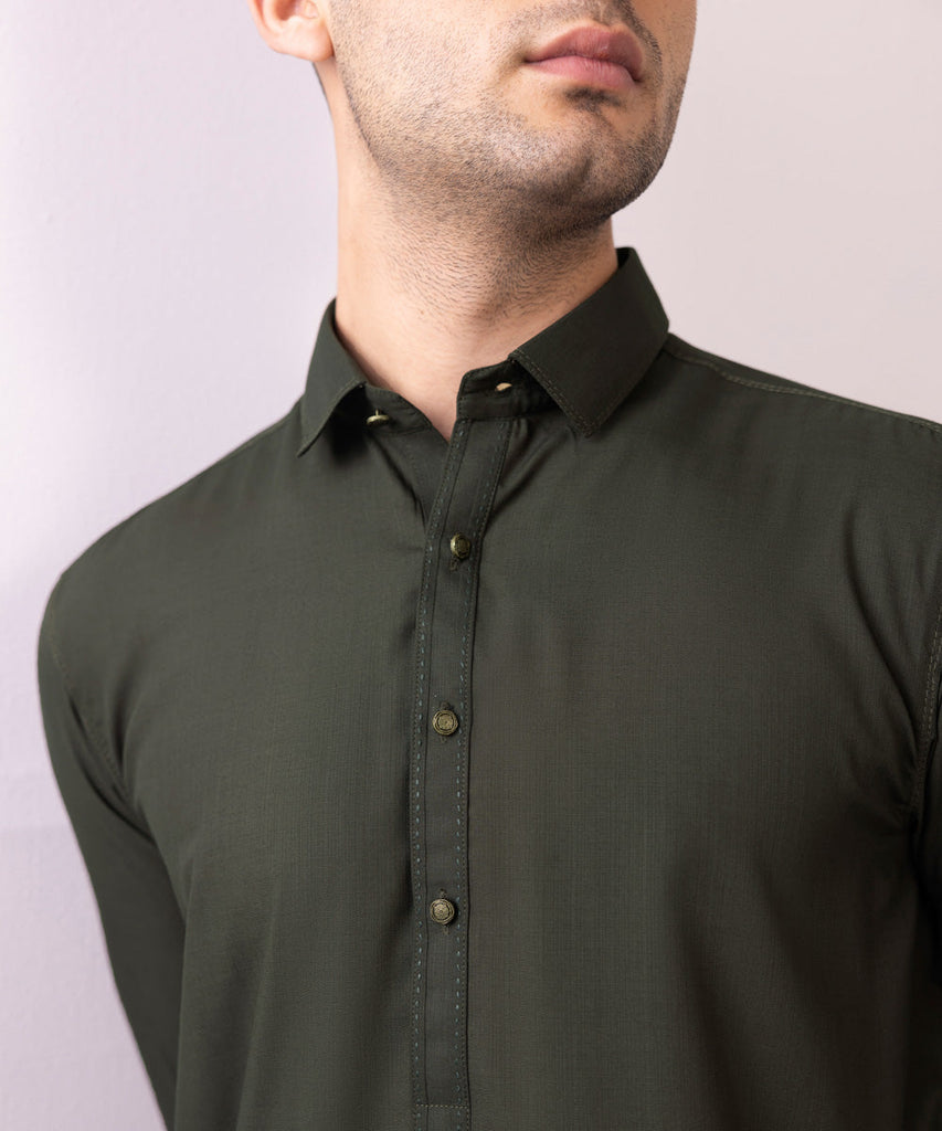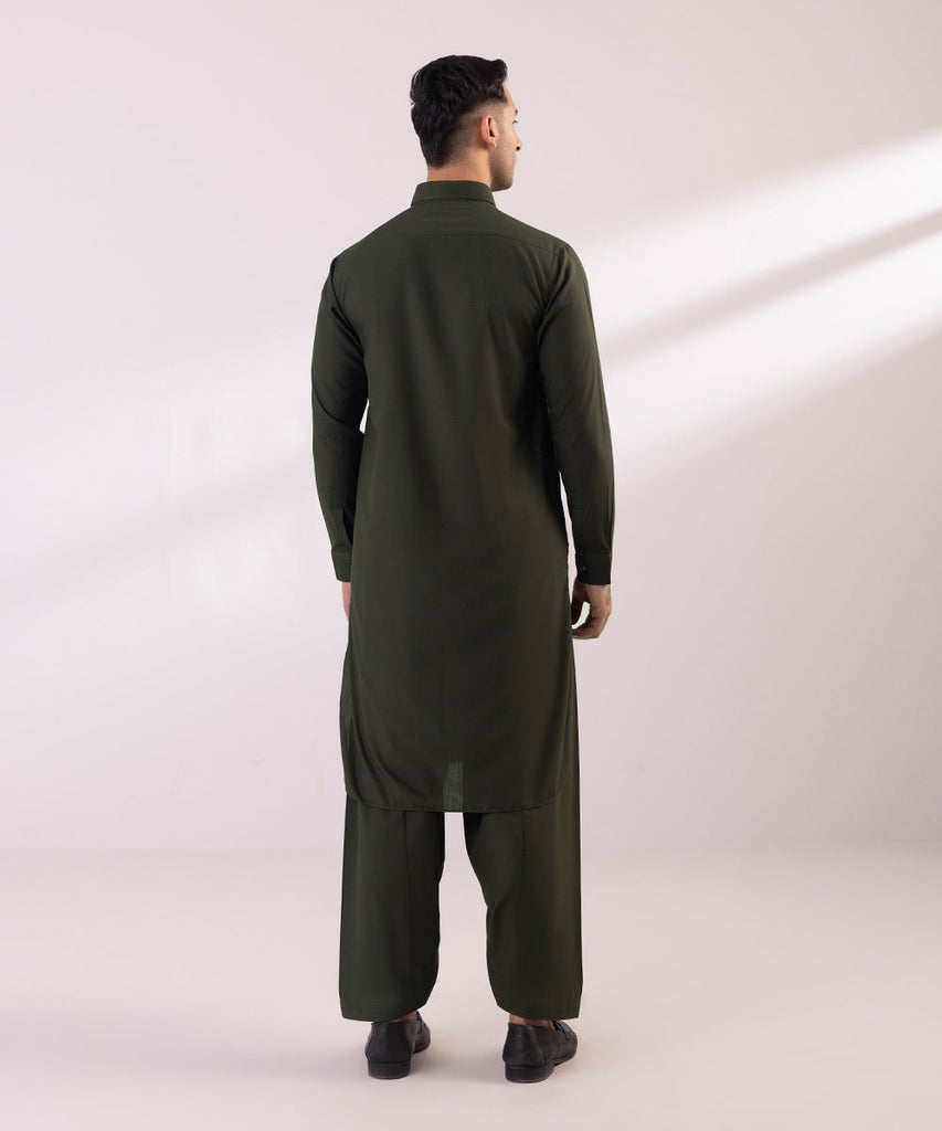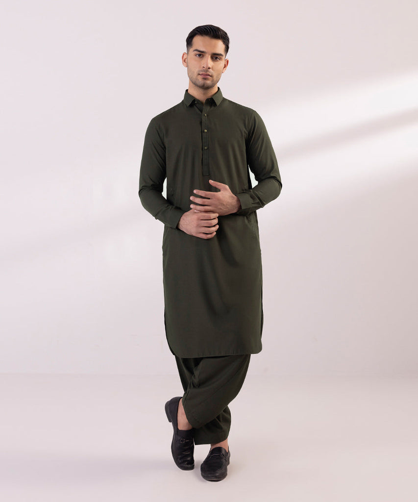 Create a traditional look this season in our dark olive fancy wash & wear straight kurta paired with shalwar.