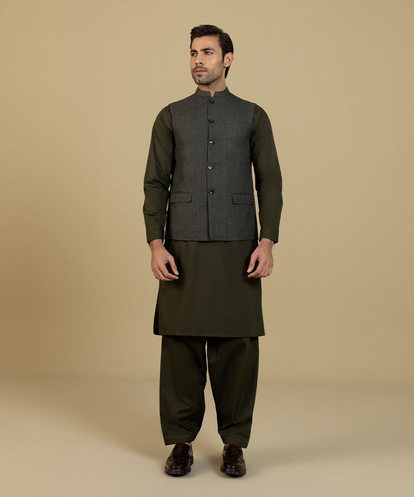 Elevate your outfit with our olive tropical fabric waistcoat.