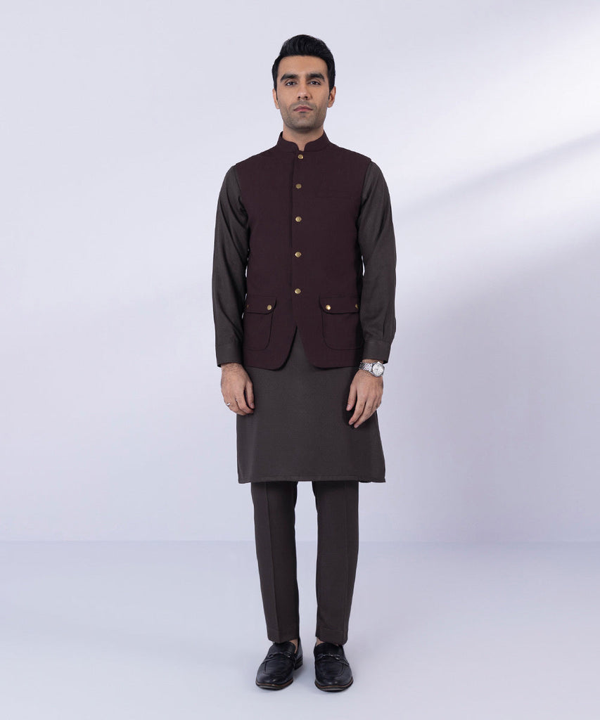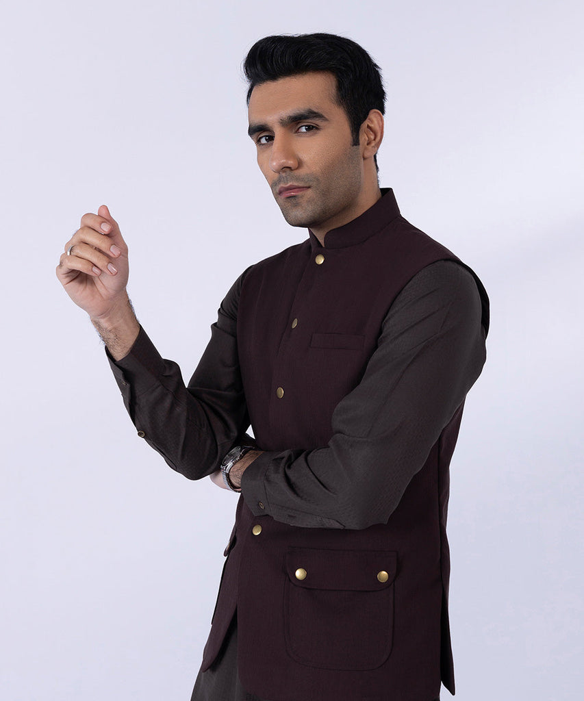 Waist Coat Make a statement with our maroon waistcoat in tropical fabric.