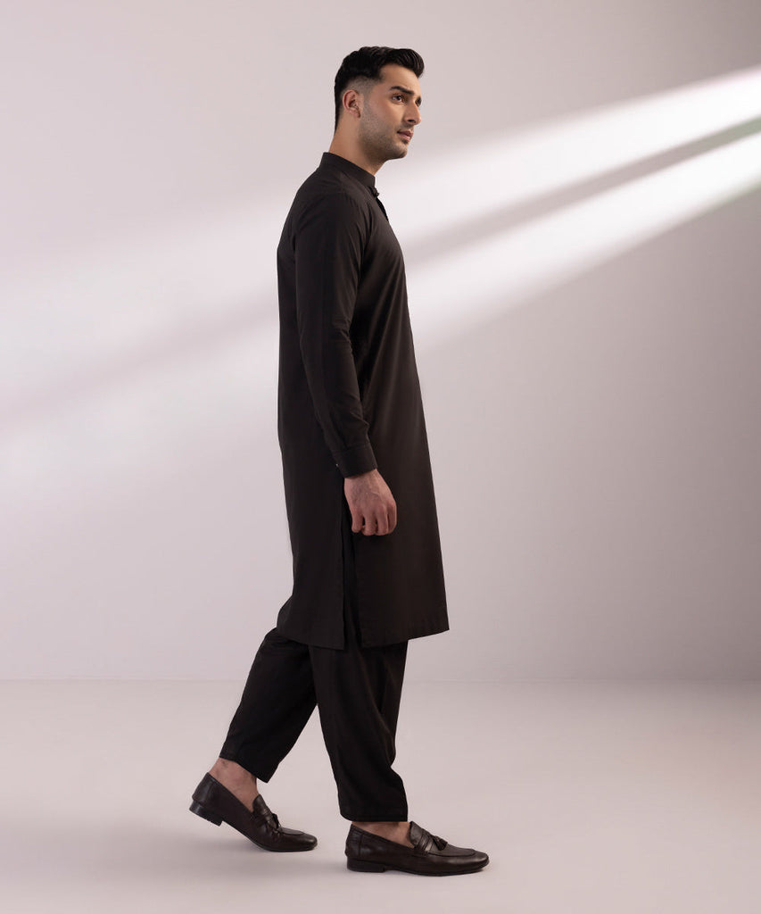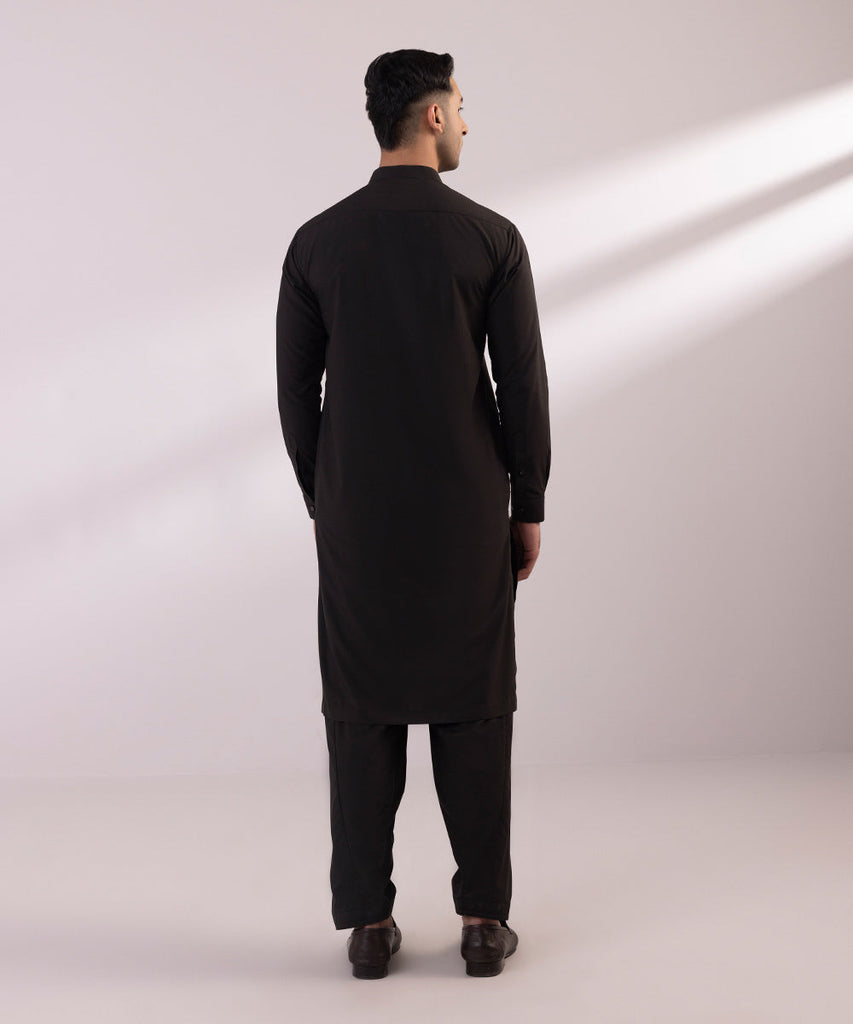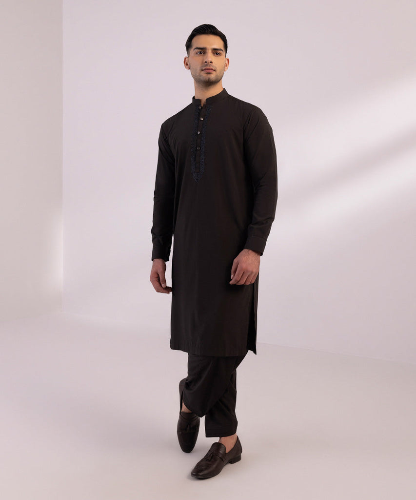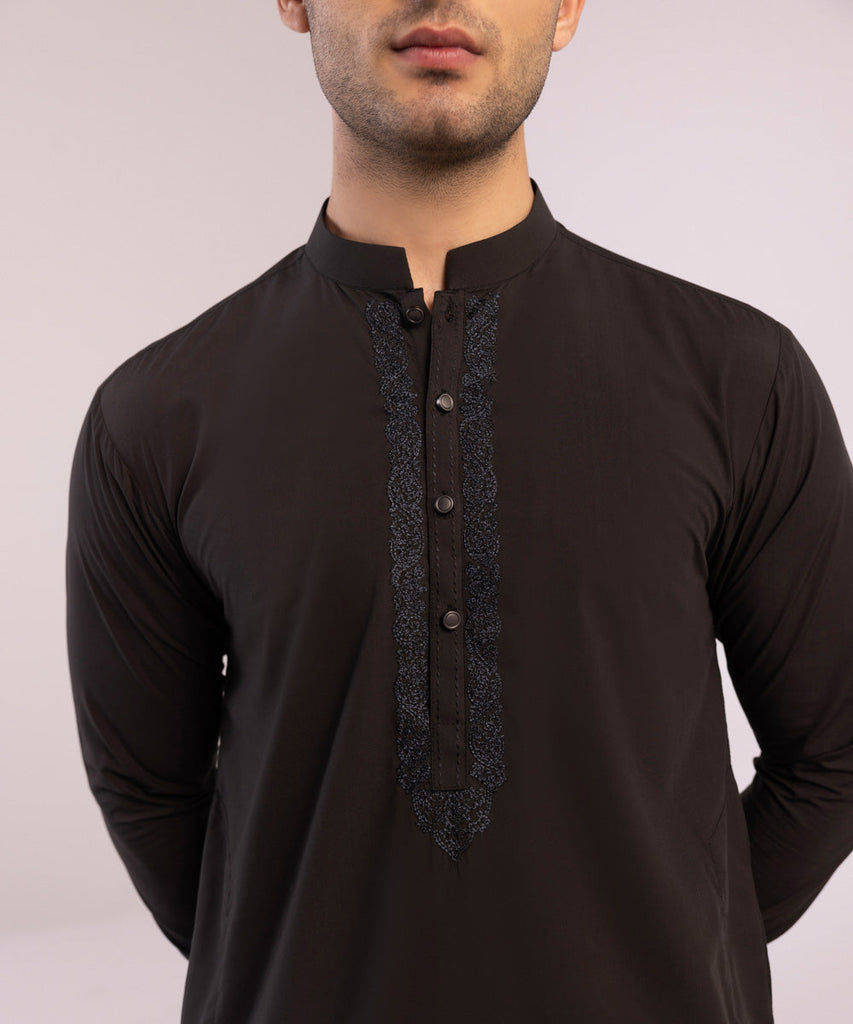 Redefine your summer style in our lightweight, and breathable embroidered black two-piece suit. With the finest quality blended modal wrinkle-free fabric, elevate your traditional look with unparalleled sophistication.