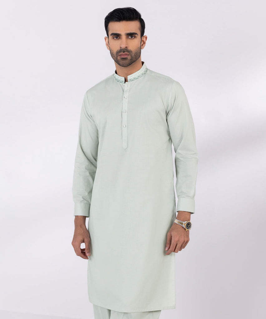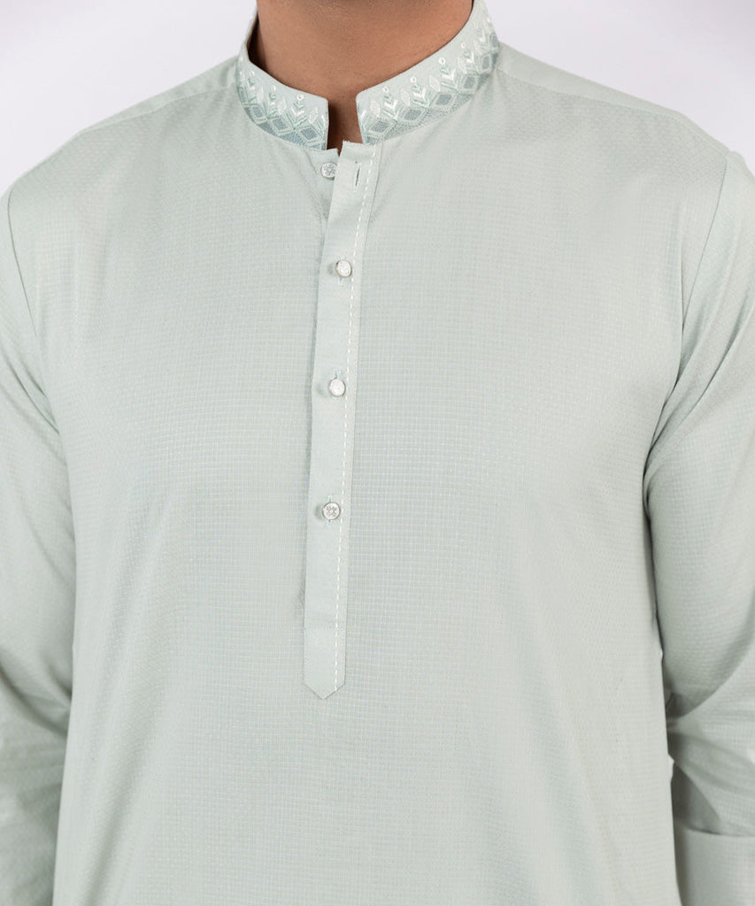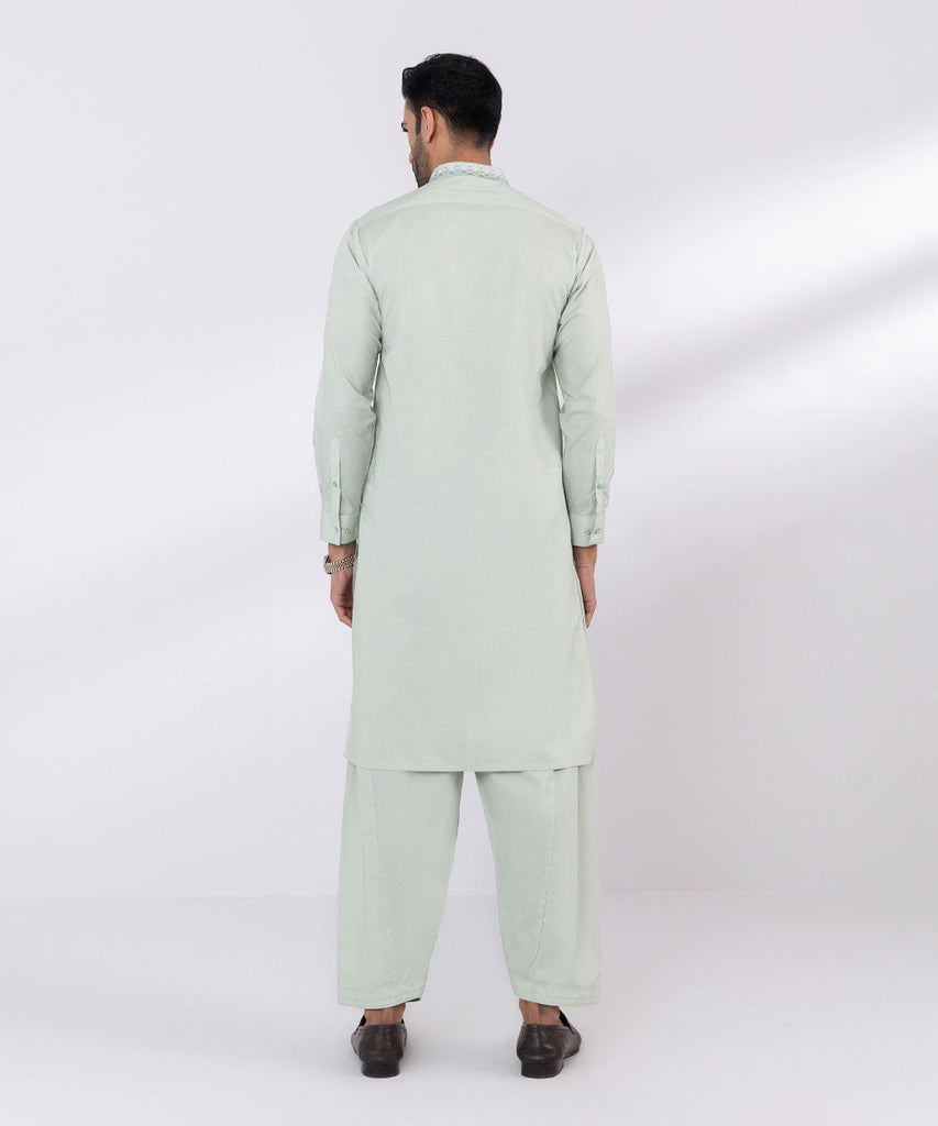 Elevate your everyday style in our light green embroidered cotton dobby straight kurta and shalwar.