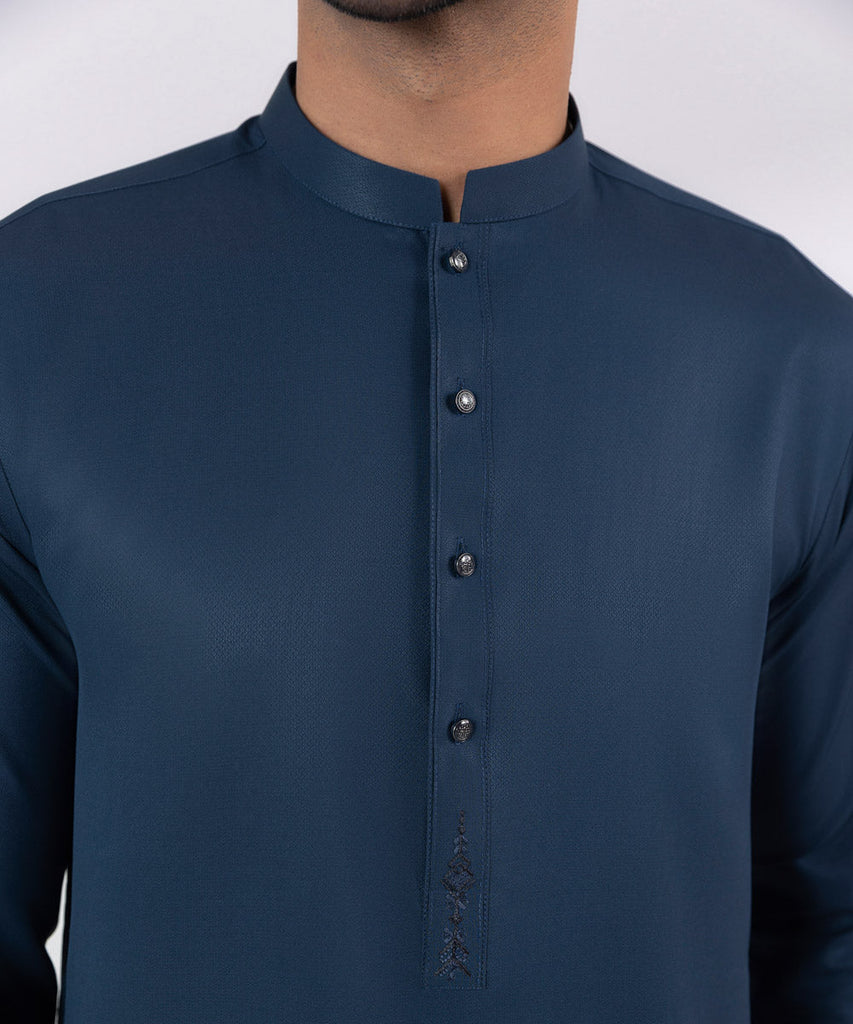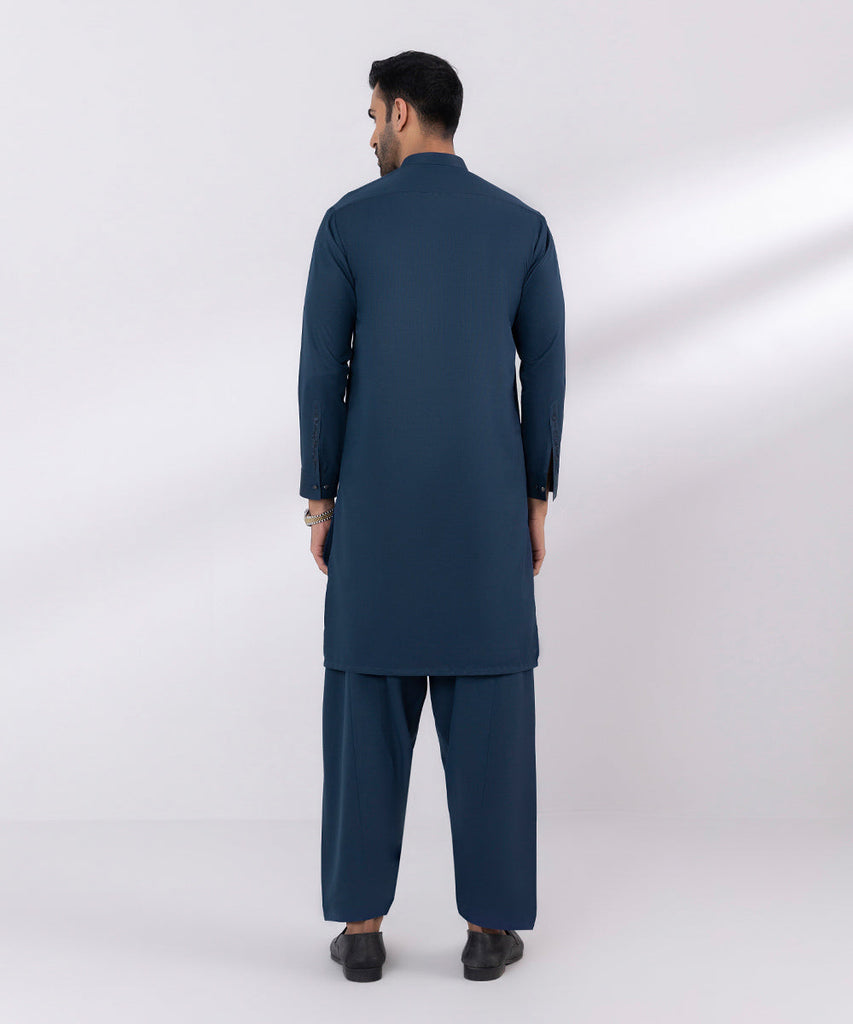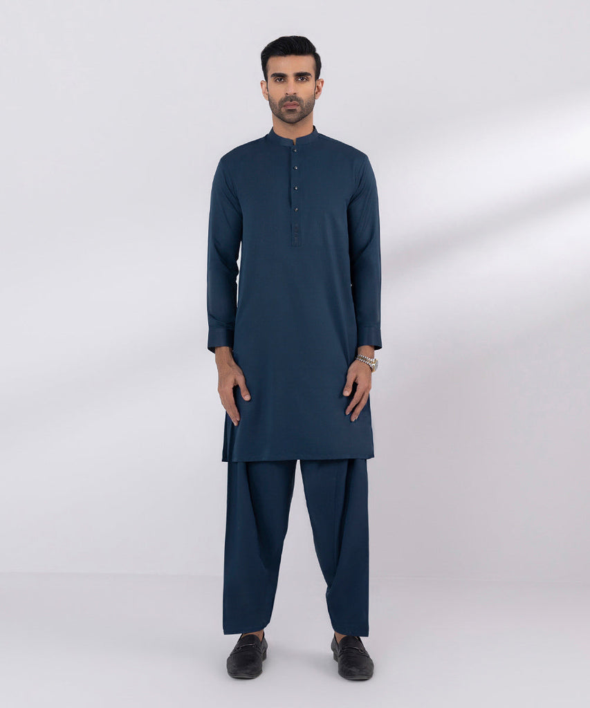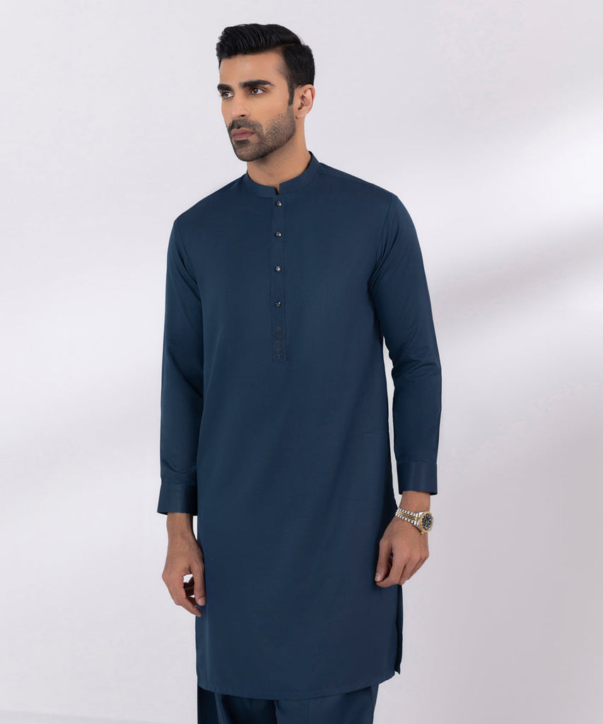 Create a traditional look this season in our royal blue premium wash & wear straight kurta paired with shalwar.