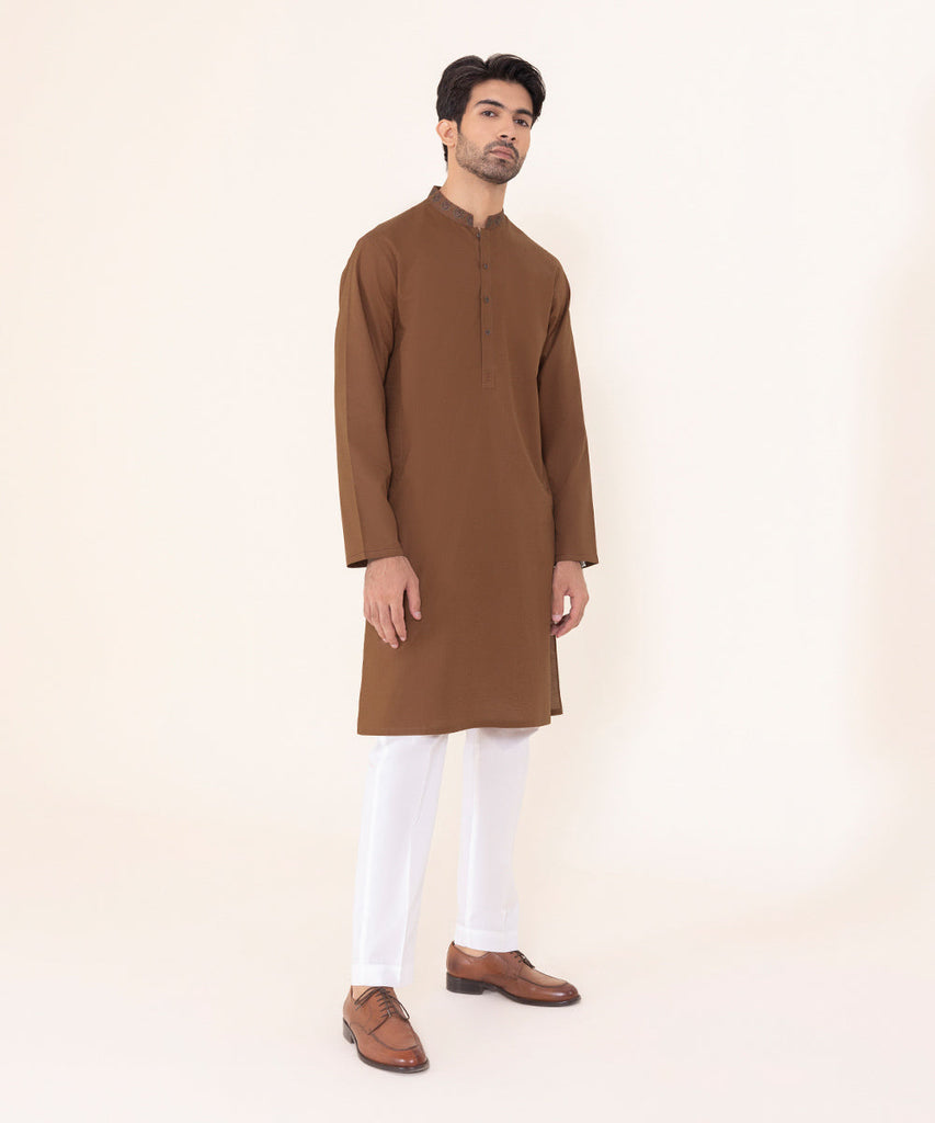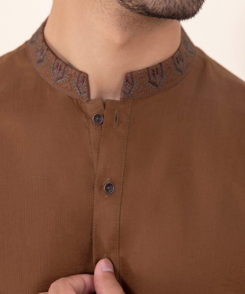 For an elevated statement opt for our rust brown embroidered jacquard kurta.