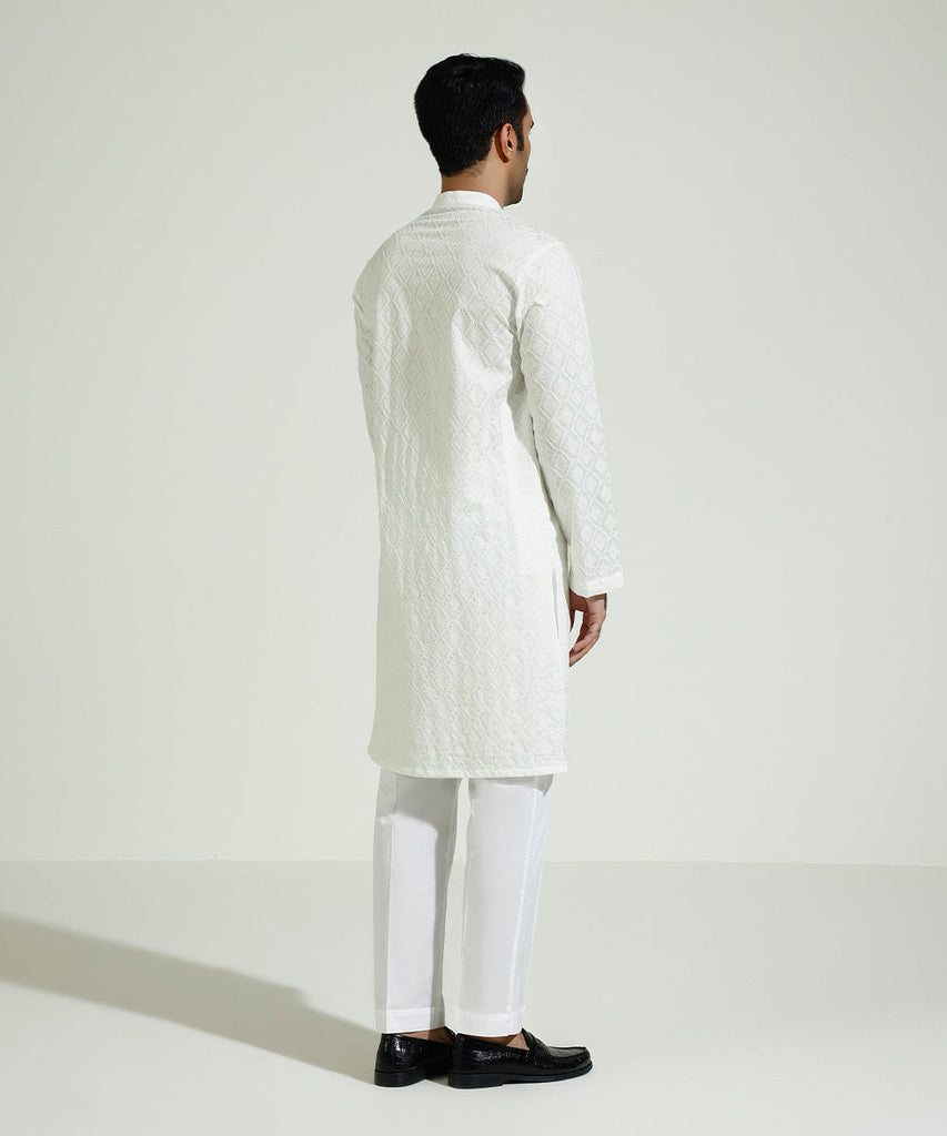 This Eid, look graceful in our white schiffli embroidered kurta.