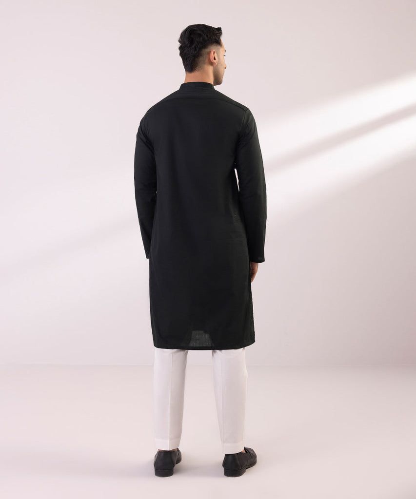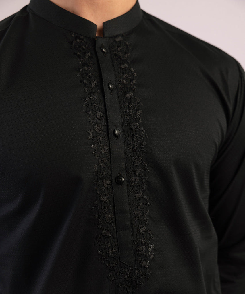 Enhance your everyday look with our black embroidered cotton dobby kurta.