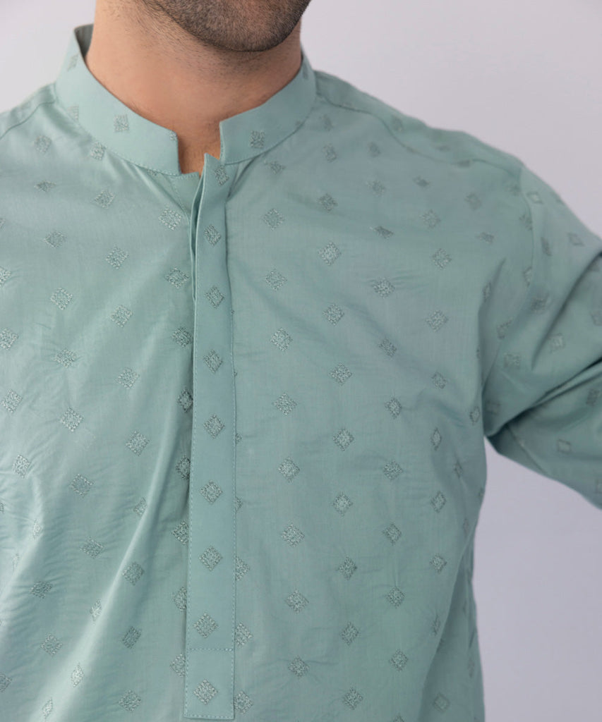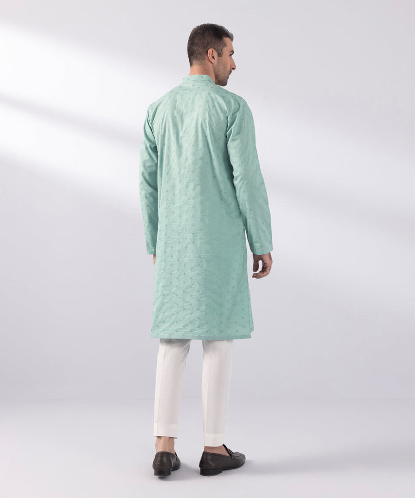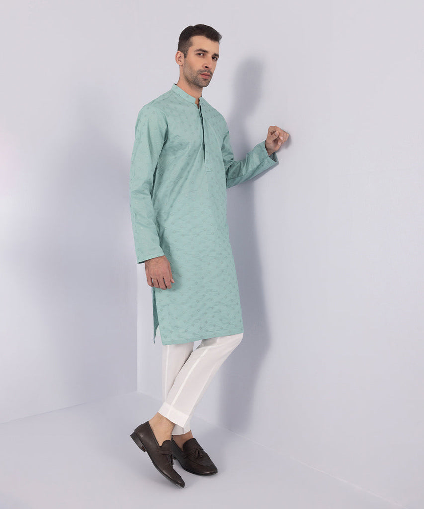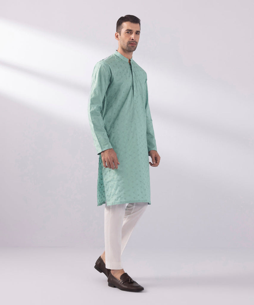 Curate the perfect festive look with our all-over schiffli embroidered green kurta.
