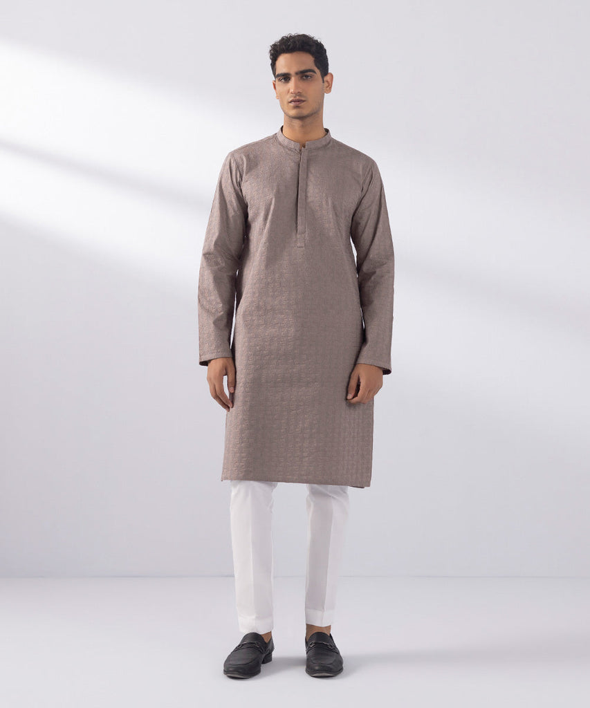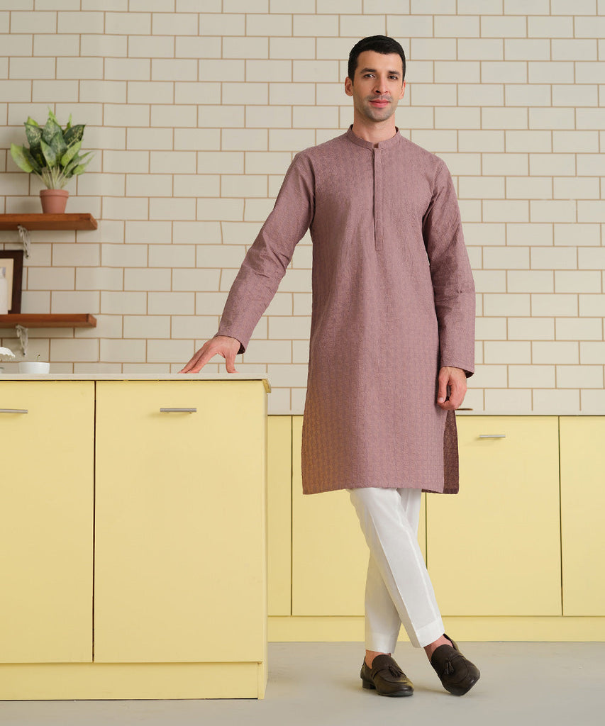 Curate the perfect festive look with our all-over schiffli embroidered mauve kurta.