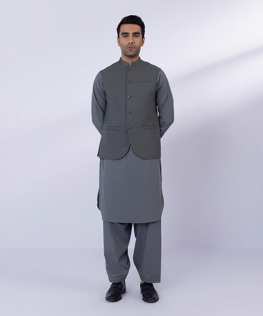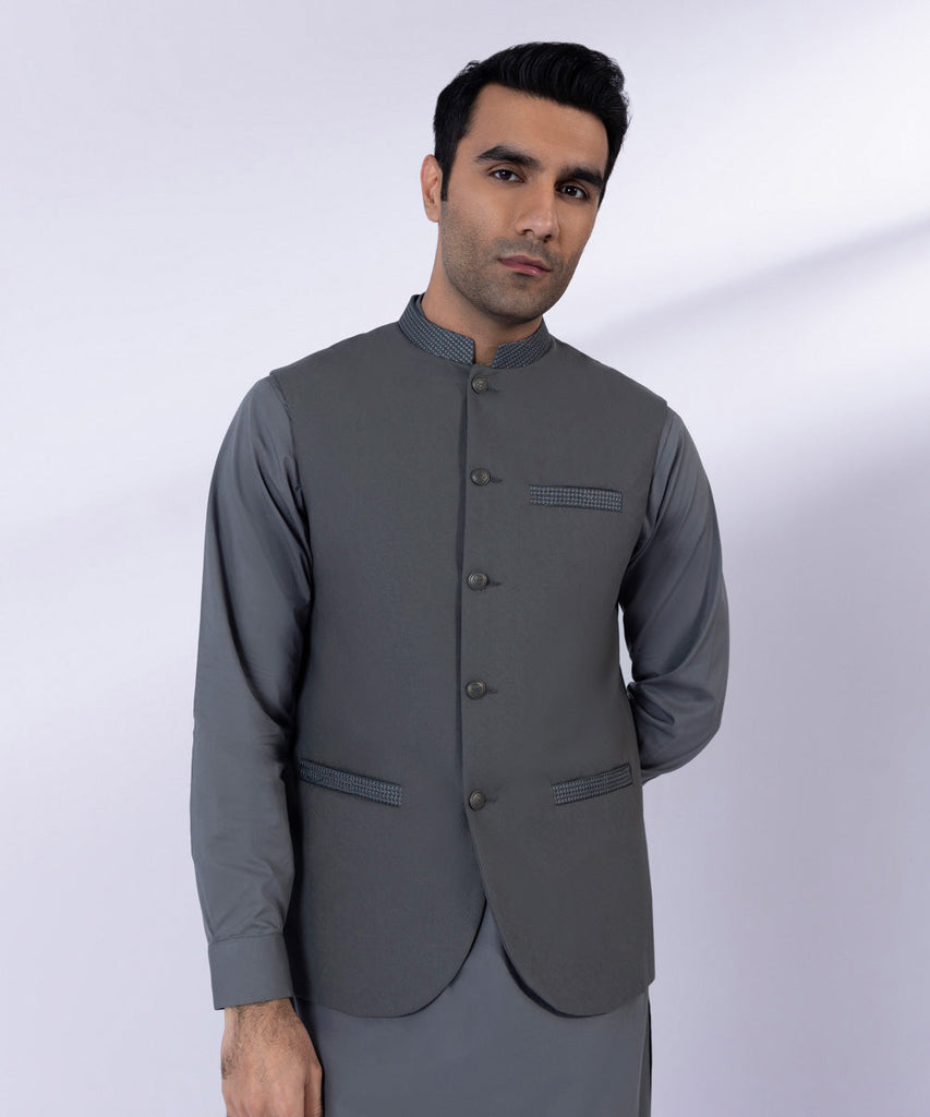 Waist Coat Make a statement with our grey embroidered waistcoat in tropical fabric.