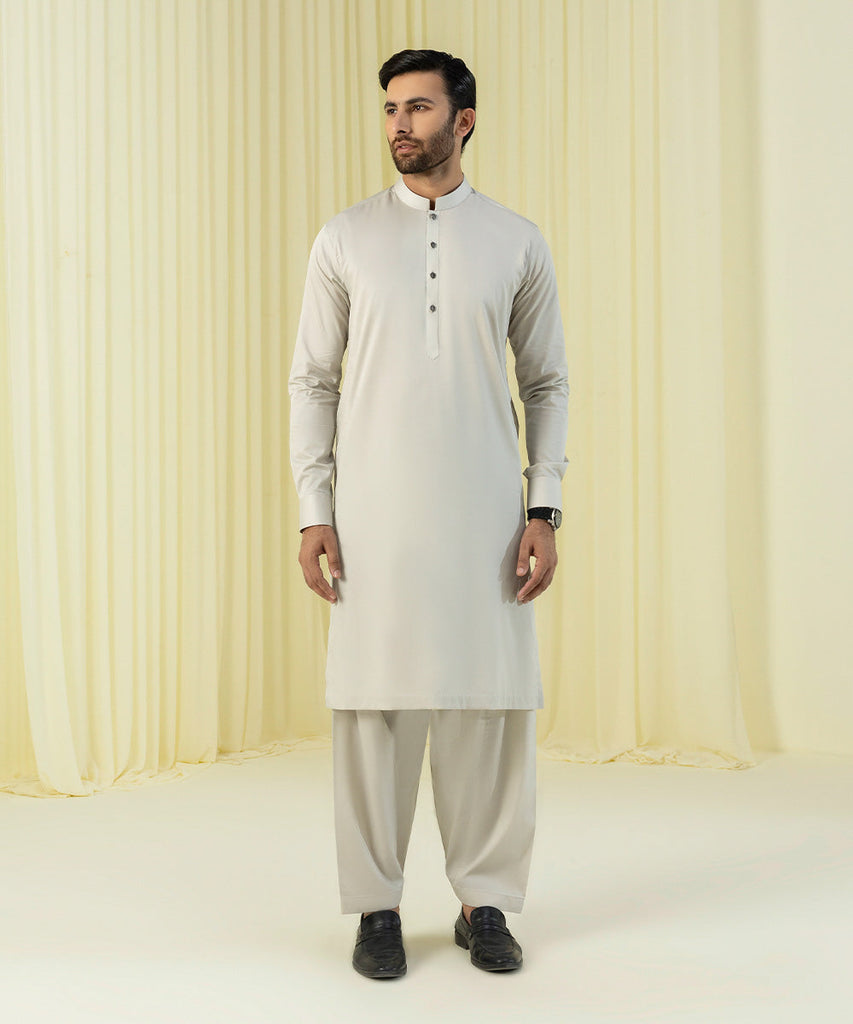 Turn heads with this khaki two-piece Egyptian cotton suit featuring dark grey buttons.Details: Shirt & Trouser 4....