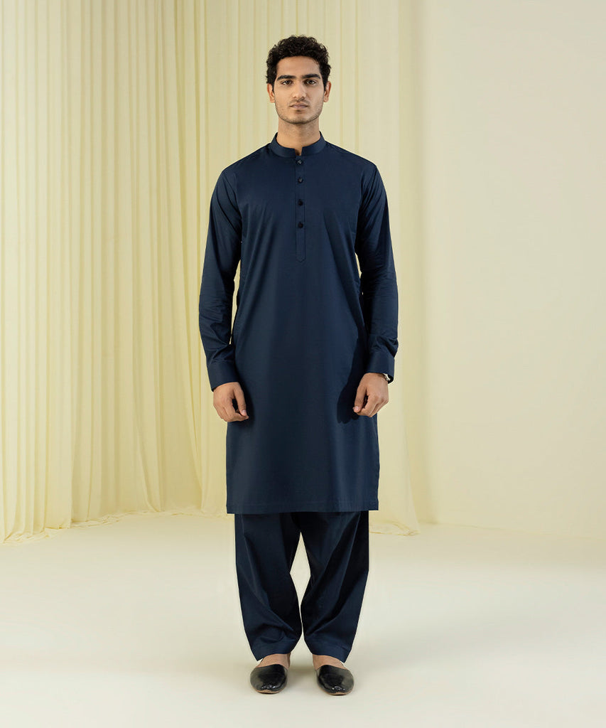 Turn heads with this navy two-piece Egyptian cotton suit featuring black buttons.