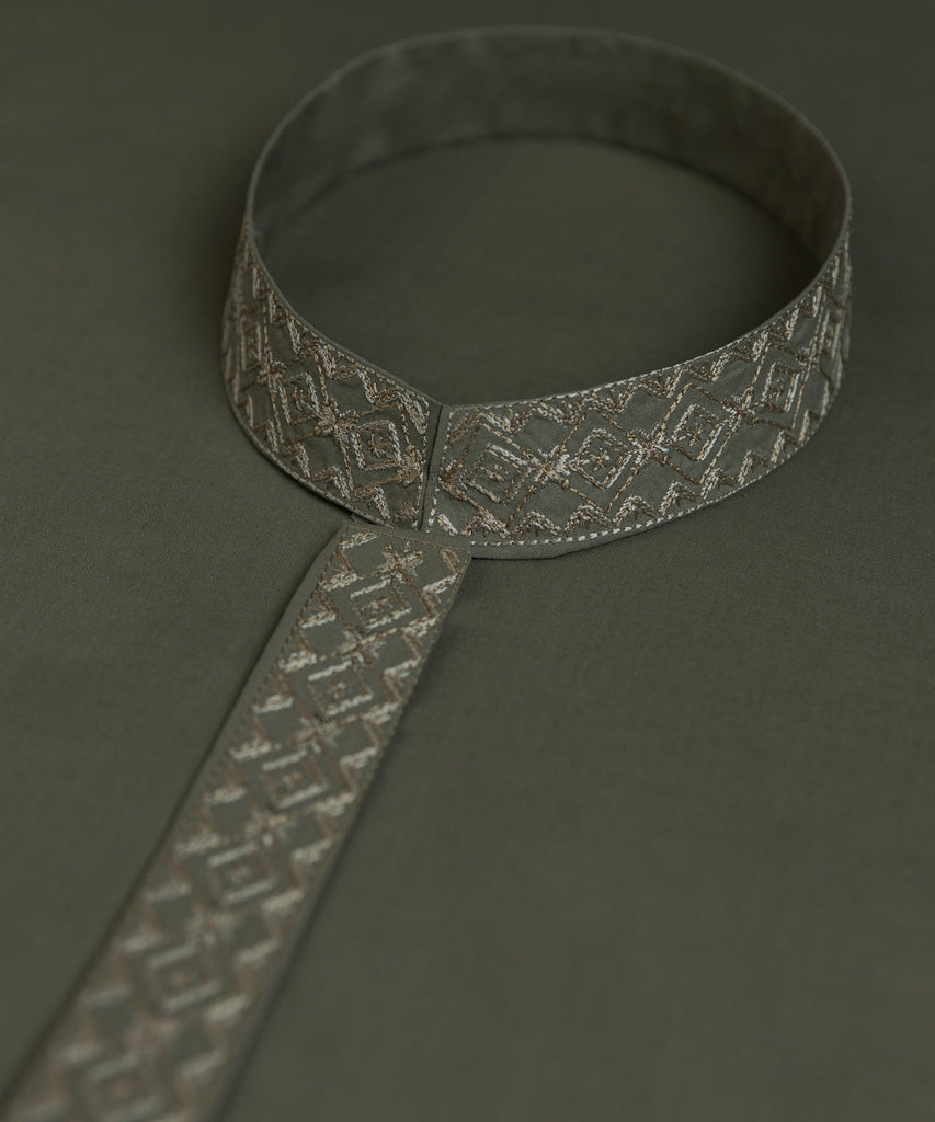 Make a fashion-forward statement this Eid with our khaki, embroidered cotton two-piece suit.