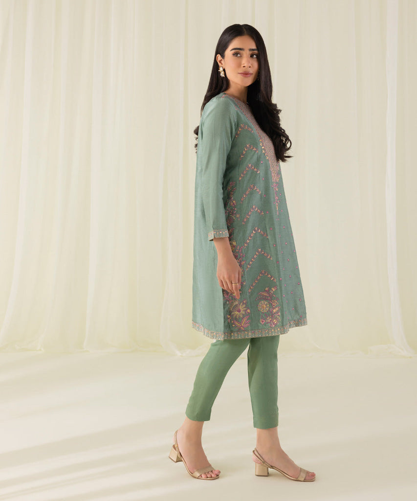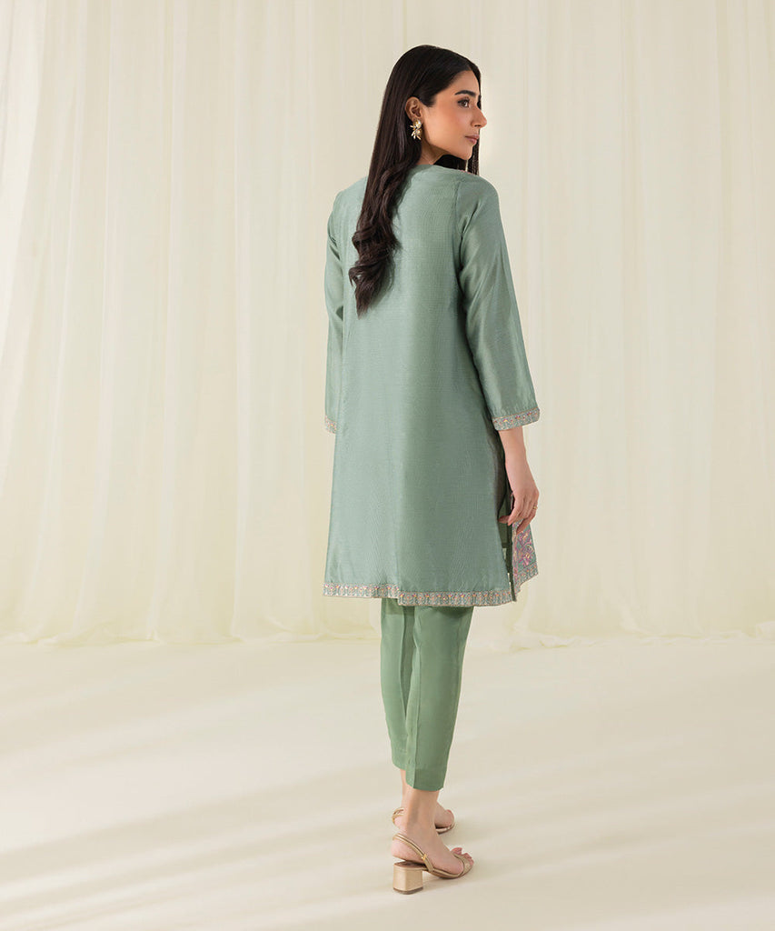 Captivate in our harmonious blend of refined texture of cotton net in green, complemented by the timeless elegance of straight silk pants. Embrace the allure of soft hued straight silhouette balanced with rich embroidery that will effortlessly elevate your Eid look.