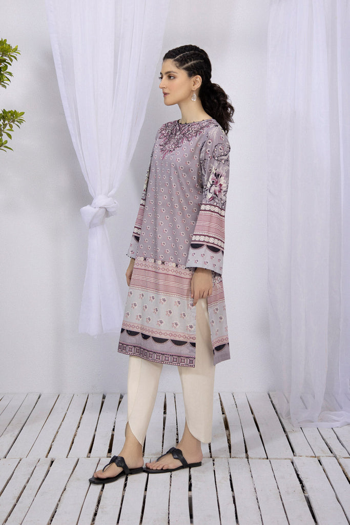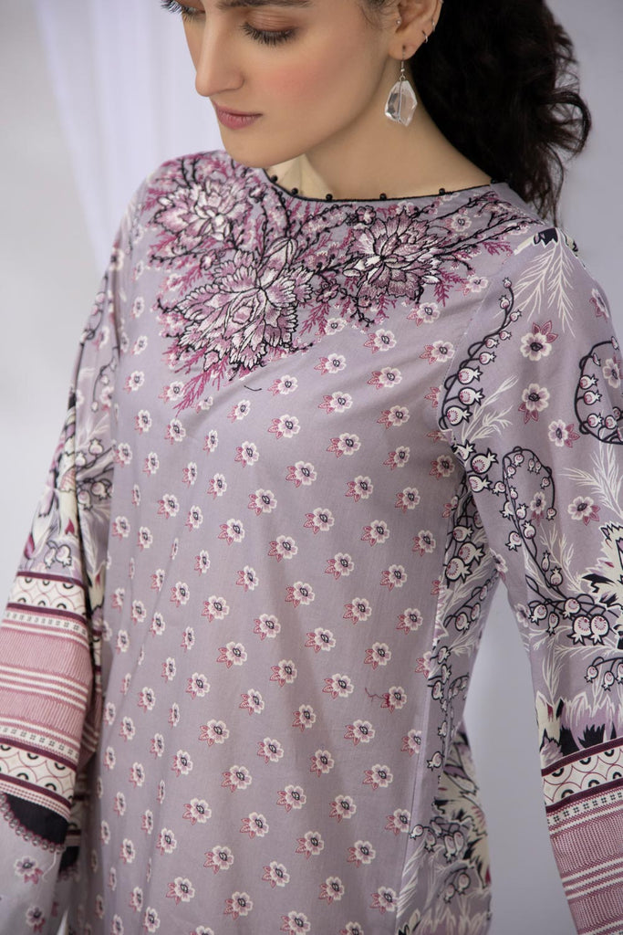 Elevate your fashion with this stitched A-line lawn kurta in light purple, canvassed with rich embroidery and a decadent floral print.
