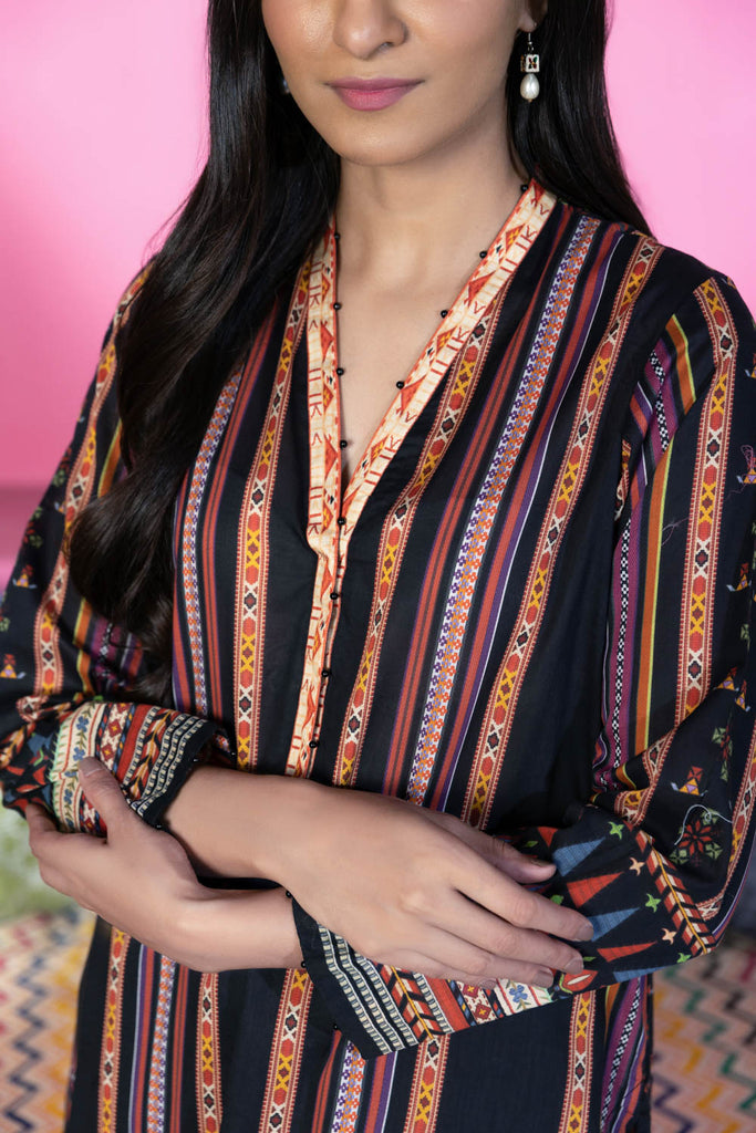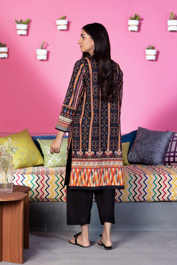 Make a statement in this pret lawn kurta featuring a dark black accented by bold orange, embroidered borders and a gorgeous A-line silhouette.