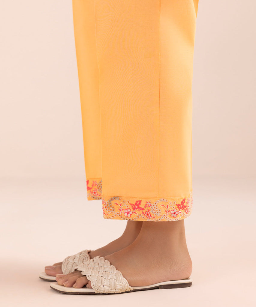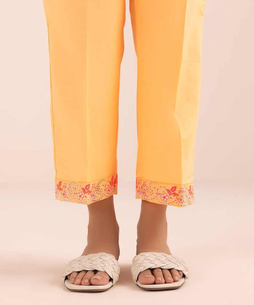Complete your seasonal outfit with our neon orange, embroidered cambric straight pants.