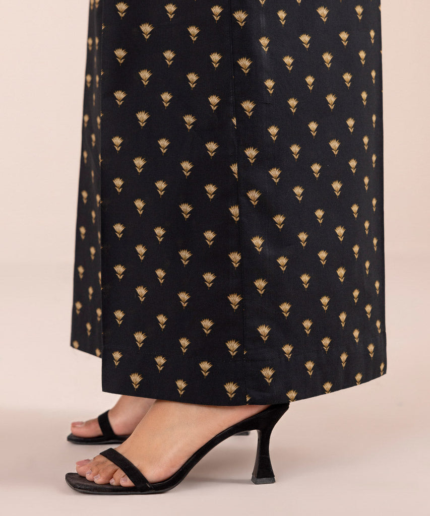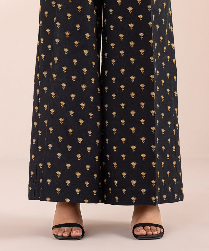 Complete your seasonal outfit this summer with our black printed cambric, flared pants.