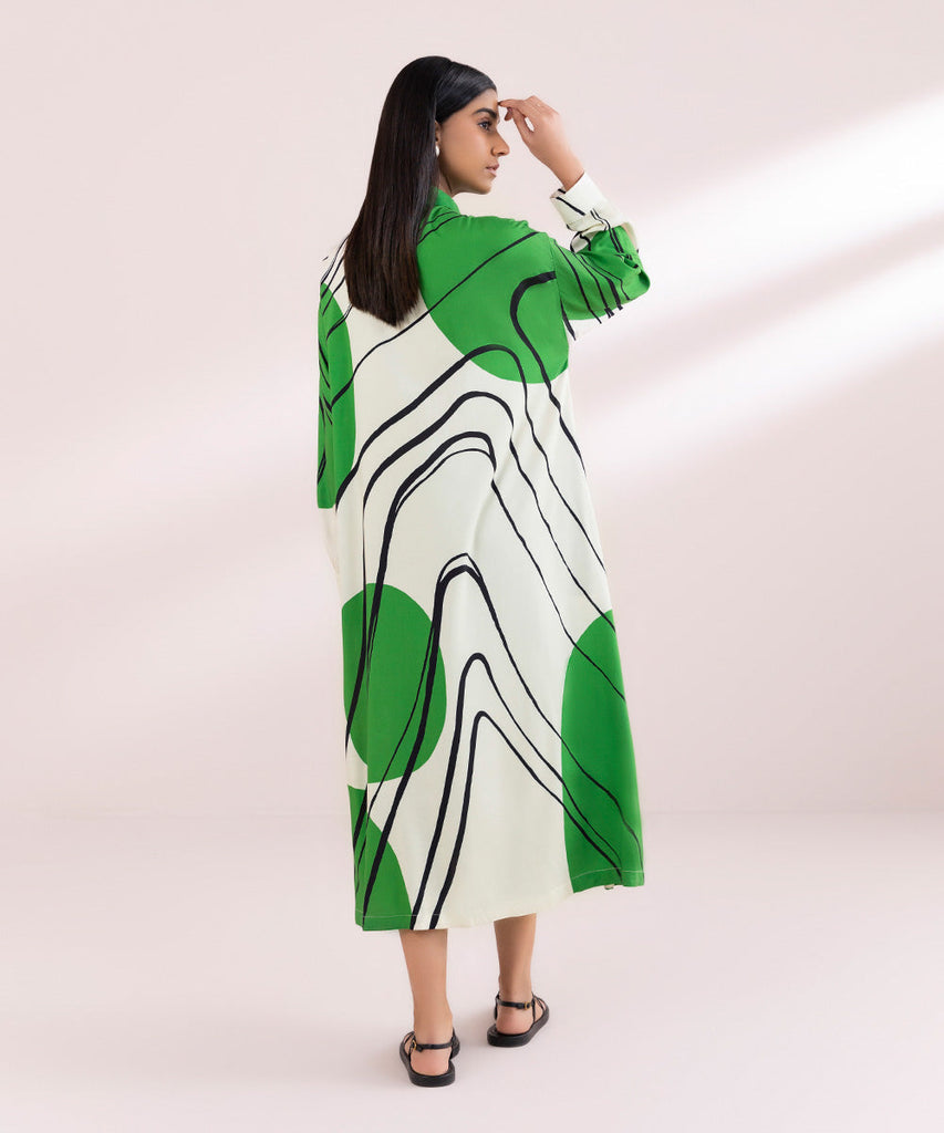 Look radiant this season with our white and green A-line button down printed shirt featuring a collared neckline with a placket.