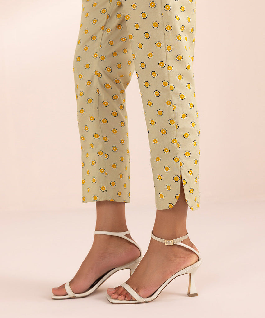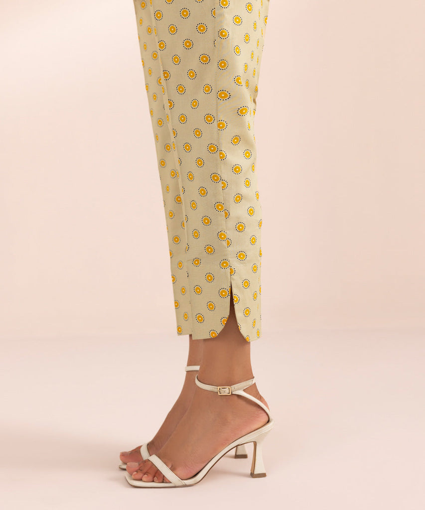Complete your seasonal outfit in our sand beige, printed cambric cigarette pants with slit.