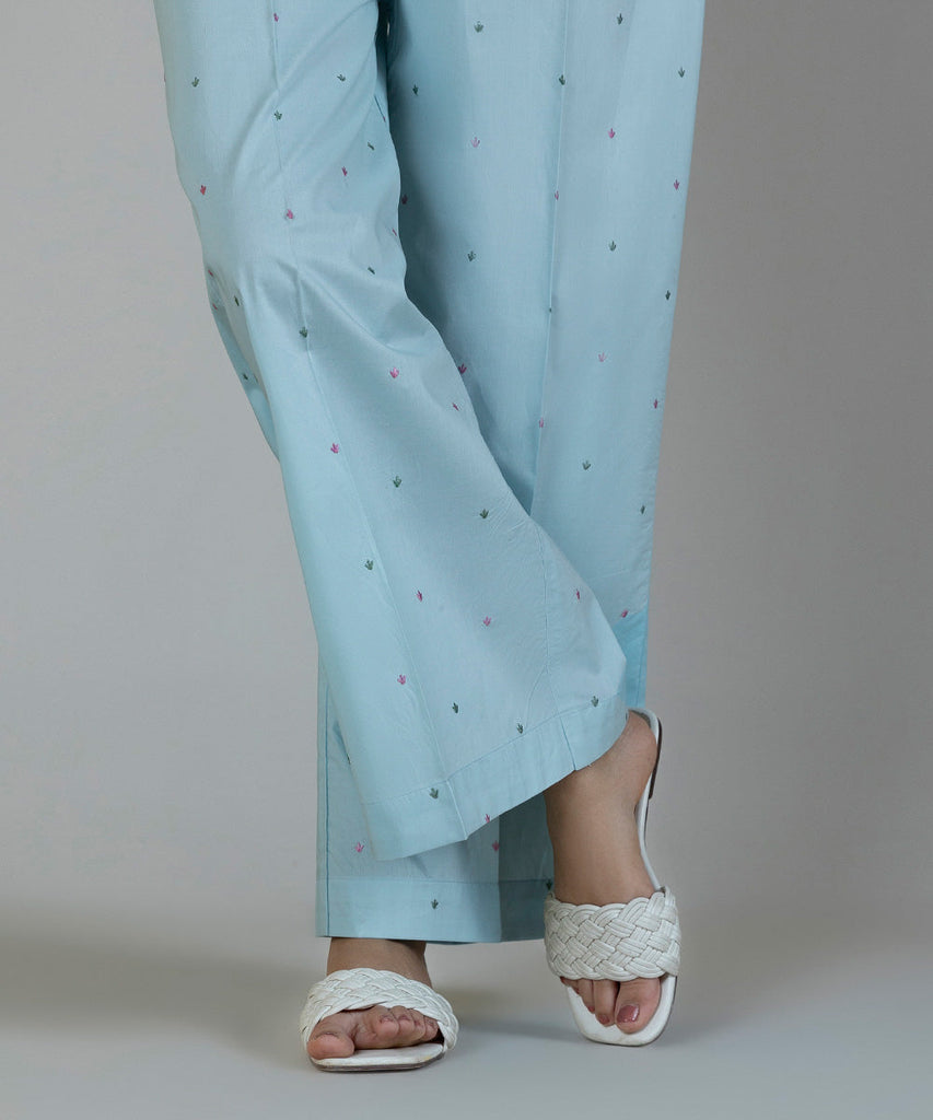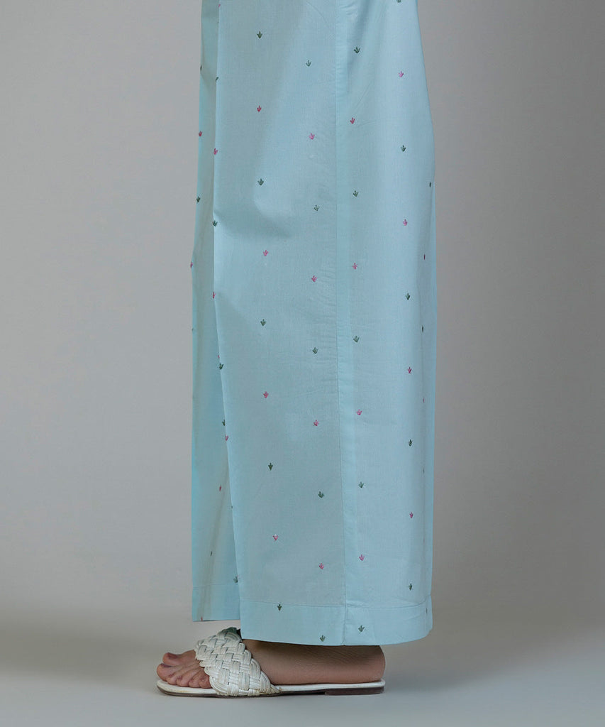 Complete your Eid look in our sky blue poplin culottes with embroidery.